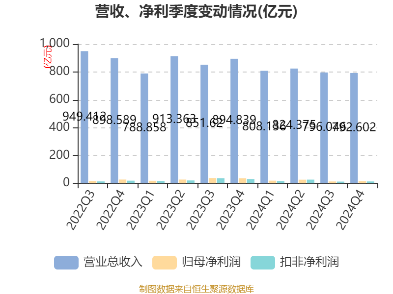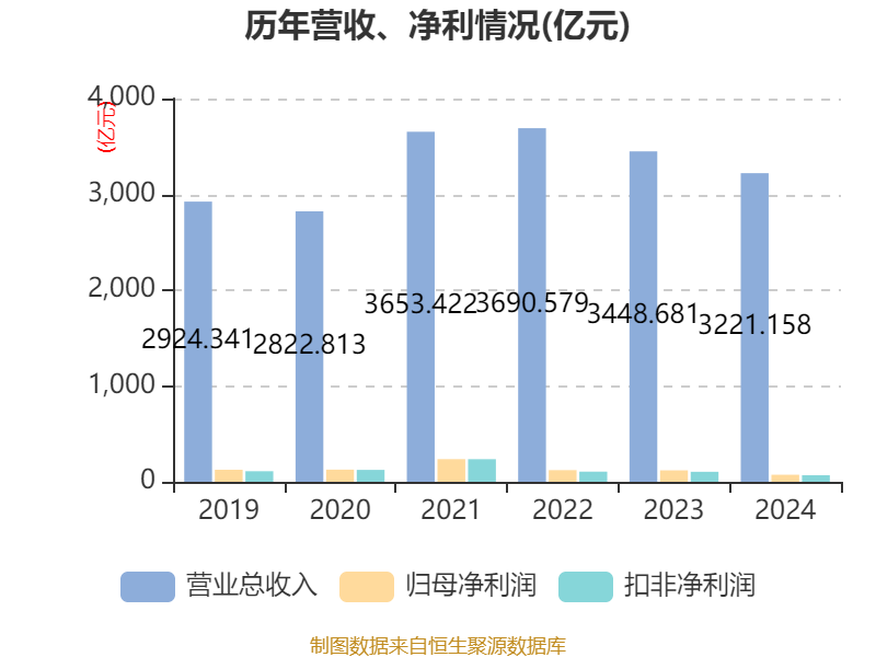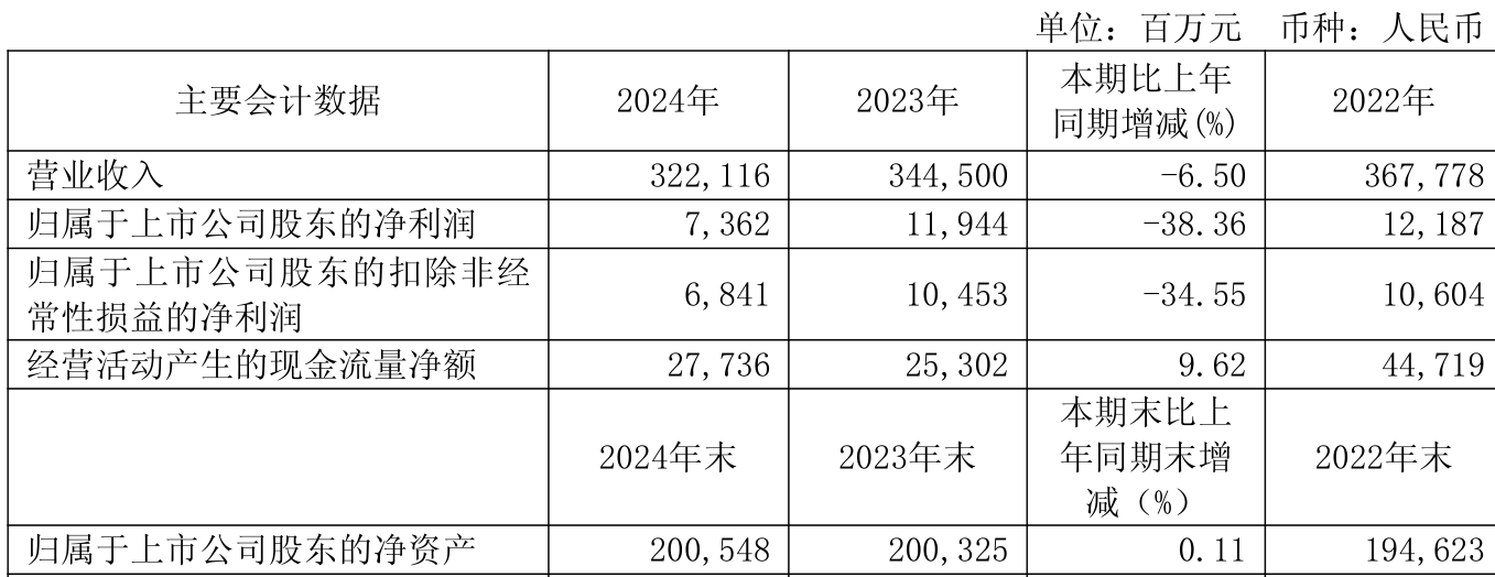 中证智能财讯宝钢股份(600019)4月26日披露2024年年度报告。2024年,公司实现营业总收入3221.16亿元,同比下降6.50%;归母净利润73.62亿元,同比下降38.36%;扣非净利润68.41亿元,同比下降34.55%;经营活动产生的现金流量净额为277.36亿元,同比增长9.62%;报告期内,宝钢股份基本每股收益为0.34元,加权平均净资产收益率为3.65%。公司2024年度分配预案为:拟向全体股东每10股派现1元(含税)。