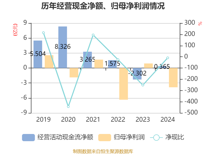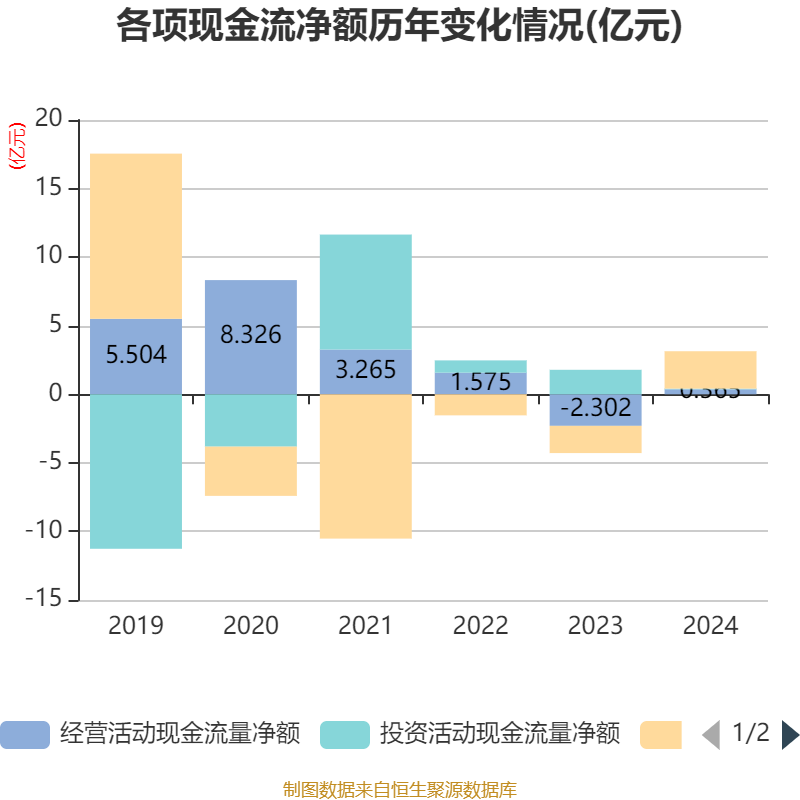 截至2024年,公司经营活动现金流净额为3646.06万元,同比增加2.67亿元;筹资活动现金流净额2.73亿元,同比增加4.71亿元;投资活动现金流净额482.45万元,上年同期为1.79亿元。