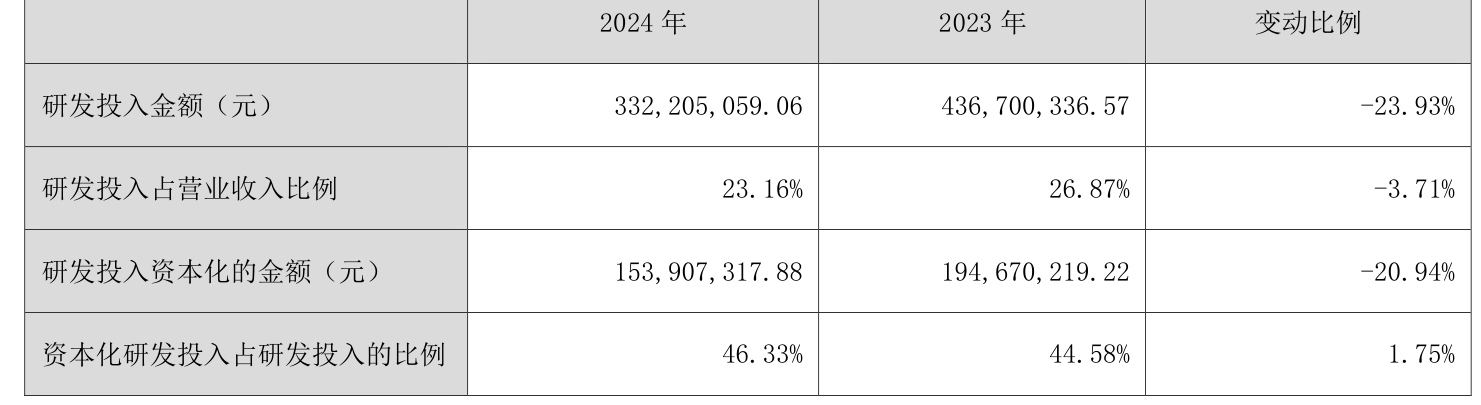 2024年全年,公司研发投入金额为3.32亿元,同比下降23.93%;研发投入占营业收入比例为23.16%,相比上年同期下降3.71个百分点。此外,公司全年研发投入资本化率为46.33%。
