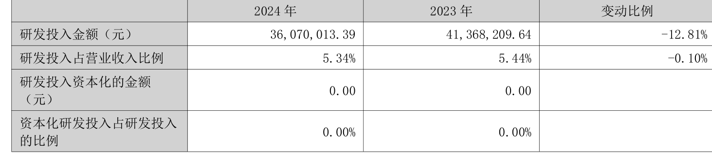 2024年全年,公司研发投入金额为3607万元,同比下降12.81%;研发投入占营业收入比例为5.34%,相比上年同期下降0.1个百分点。此外,公司全年研发投入资本化率为0%。