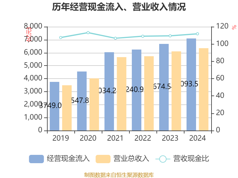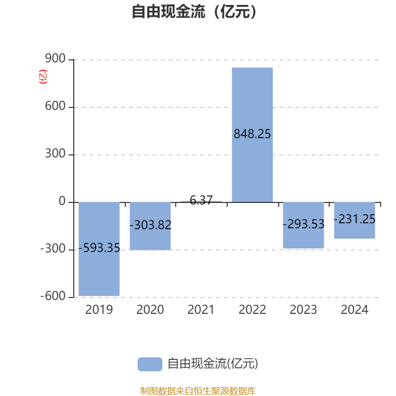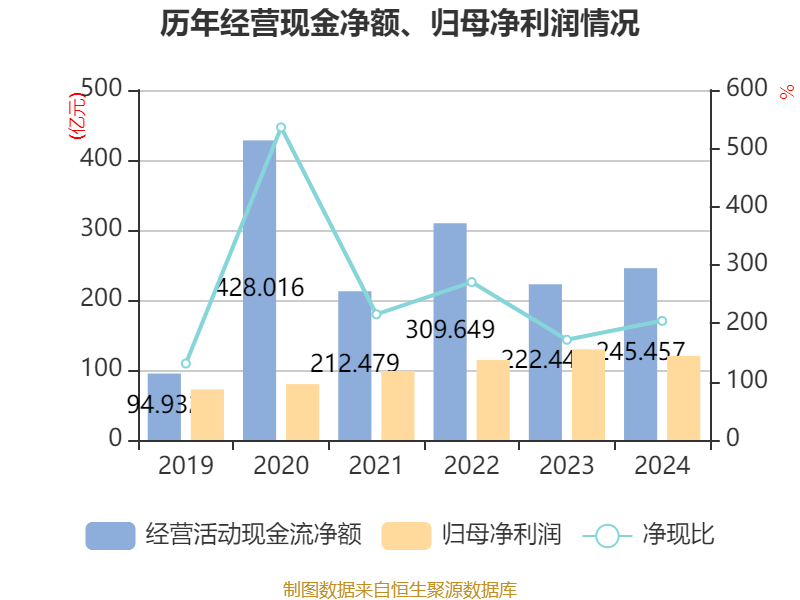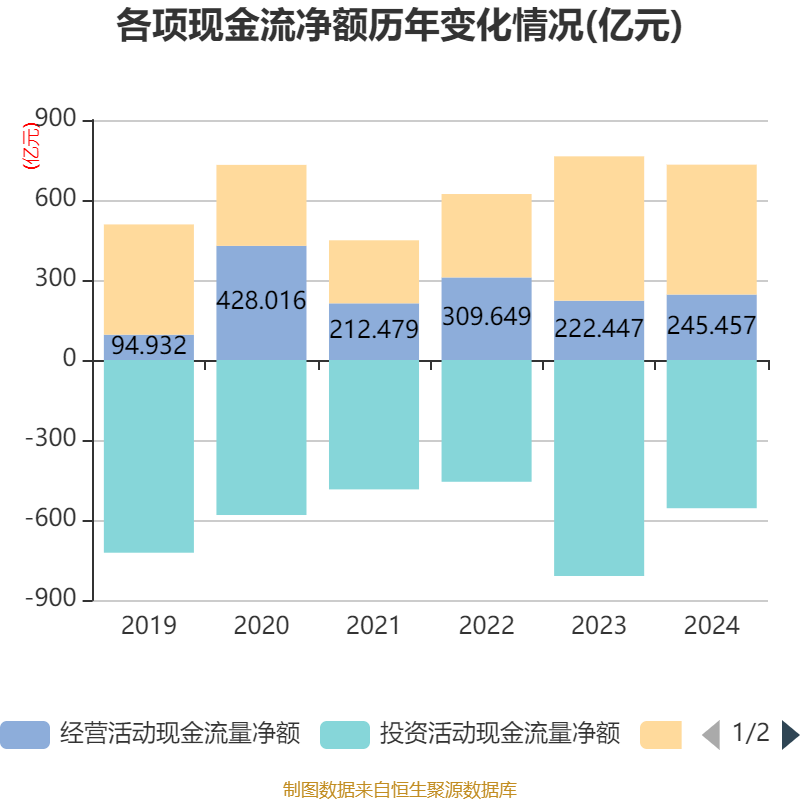 截至2024年,公司经营活动现金流净额为245.46亿元,同比增长10.34%;筹资活动现金流净额487.03亿元,同比减少54.3亿元;投资活动现金流净额-555.8亿元,上年同期为-809.94亿元。