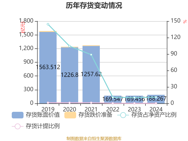 从存货变动来看,截至2024年末,公司存货账面价值为188.27亿元,占净资产的11.37%,较上年末增加18.81亿元。其中,存货跌价准备为4171.07万元,计提比例为0.22%。