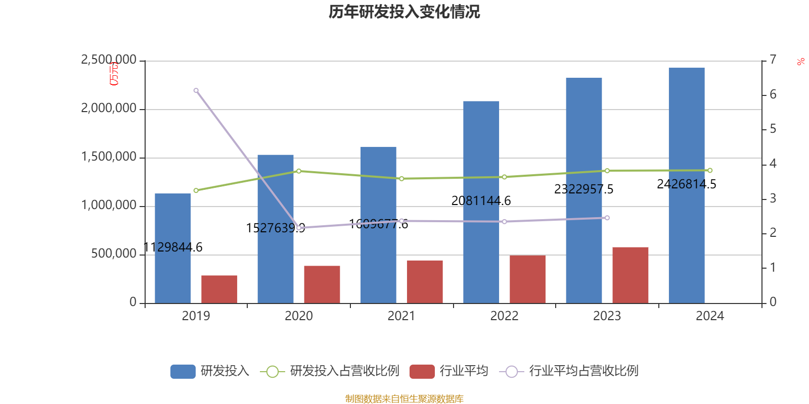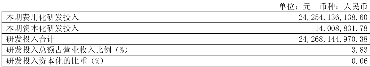 2024年全年,公司研发投入金额为242.68亿元,同比增长4.47%;研发投入占营业收入比例为3.83%,相比上年同期上升0.01个百分点。此外,公司全年研发投入资本化率为0.06%。