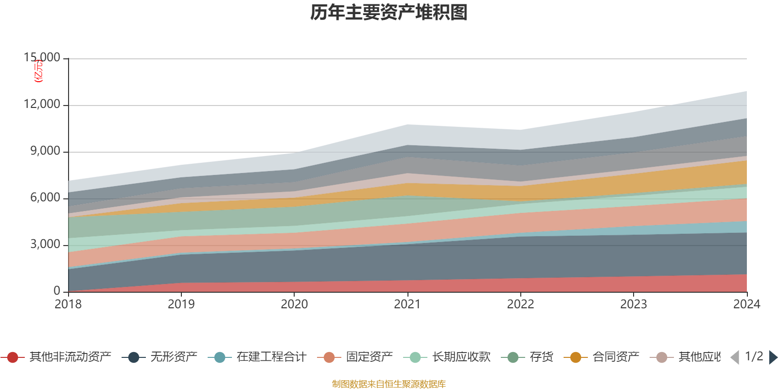 资产重大变化方面,截至2024年末,公司无形资产较上年末增加0.43%,占公司总资产比重下降2.33个百分点;合同资产较上年末增加21.32%,占公司总资产比重上升0.93个百分点;在建工程合计较上年末增加31.64%,占公司总资产比重上升0.87个百分点;应收票据及应收账款较上年末增加17.71%,占公司总资产比重上升0.51个百分点。