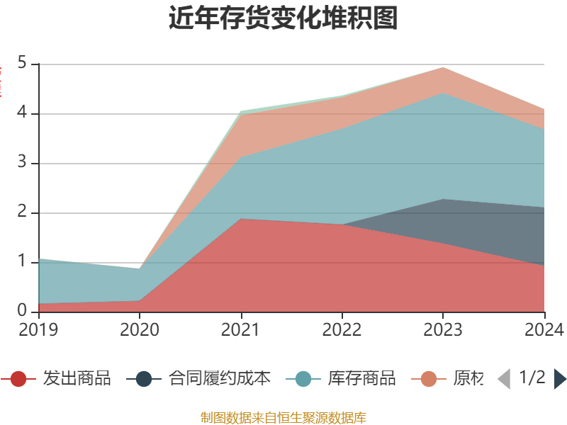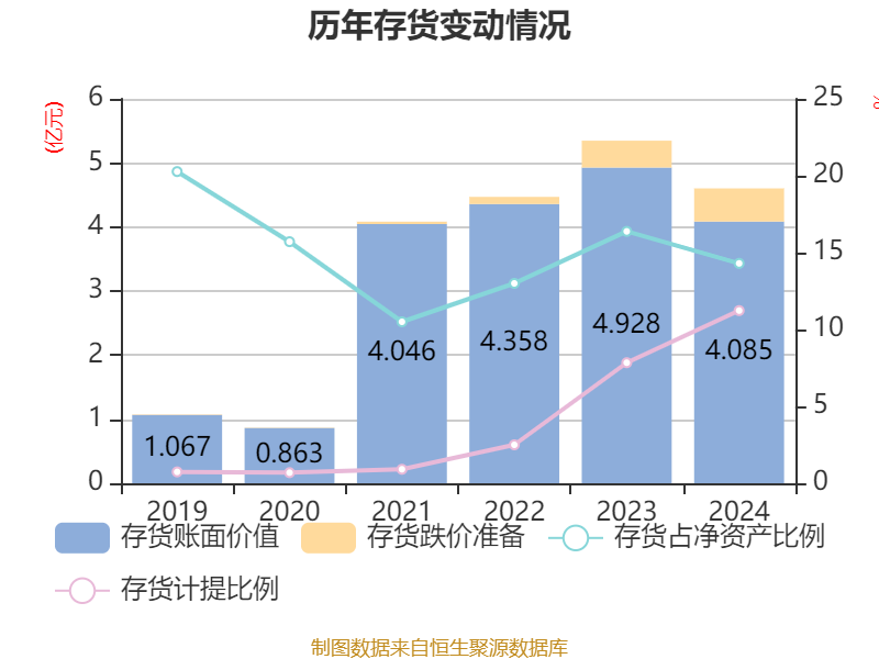 从存货变动来看,截至2024年末,公司存货账面价值为4.08亿元,占净资产的14.3%,较上年末减少8430.26万元。其中,存货跌价准备为5166.35万元,计提比例为11.23%。