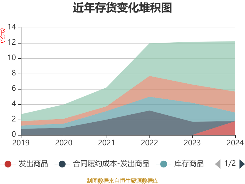 从存货变动来看,截至2024年末,公司存货账面价值为12.2亿元,占净资产的59.22%,较上年末增加502.64万元。其中,存货跌价准备为2263.96万元,计提比例为1.82%。