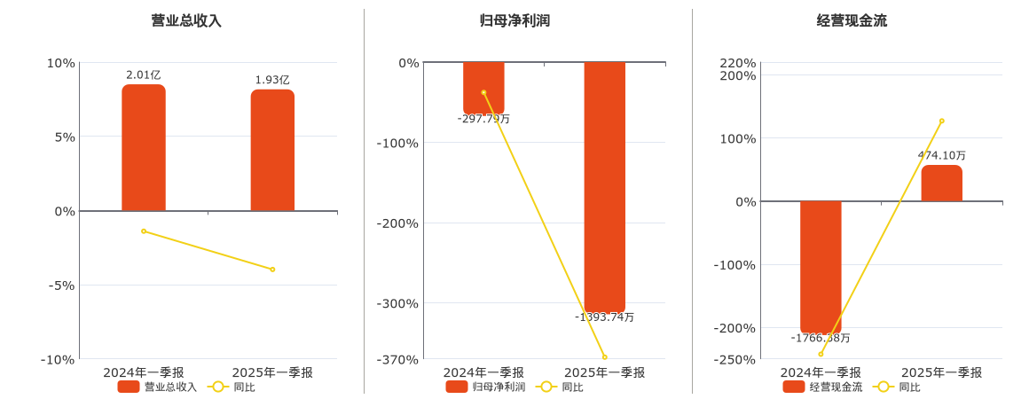 公司营业总收入为1.93亿元,在已披露的同业公司中排名第20,较去年同报告期营业总收入减少801.01万元,同比较去年同期下降3.98%。归母净利润为-1393.74万元,在已披露的同业公司中排名第27,较去年同报告期归母净利润减少1095.96万元。经营活动现金净流入为474.10万元,在已披露的同业公司中排名第17。