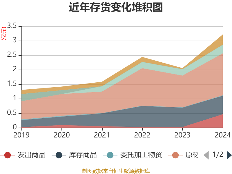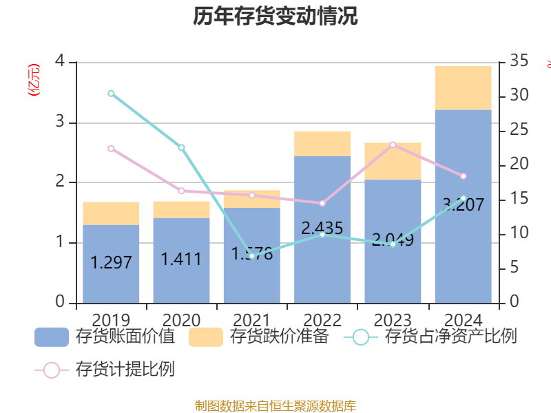 从存货变动来看,截至2024年末,公司存货账面价值为3.21亿元,占净资产的15.19%,较上年末增加1.16亿元。其中,存货跌价准备为7235.56万元,计提比例为18.41%。