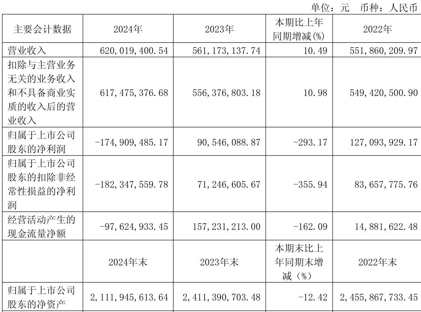 中证智能财讯炬光科技(688167)4月26日披露2024年年度报告。2024年,公司实现营业总收入6.2亿元,同比增长10.49%;归母净利润亏损1.75亿元,上年同期盈利9054.61万元;扣非净利润亏损1.82亿元,上年同期盈利7124.66万元;经营活动产生的现金流量净额为-9762.49万元,上年同期为1.57亿元;报告期内,炬光科技基本每股收益为-1.95元,加权平均净资产收益率为-7.81%。
