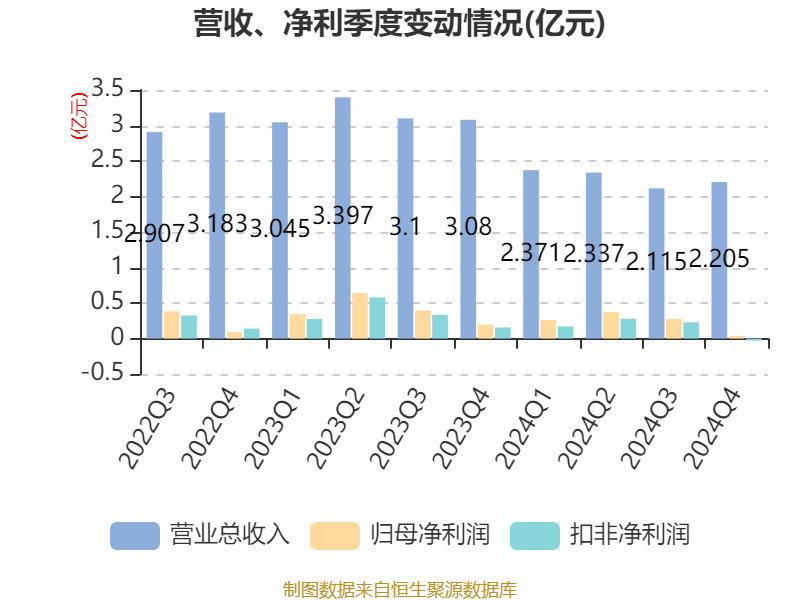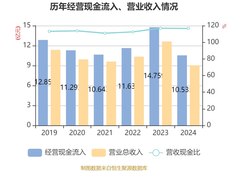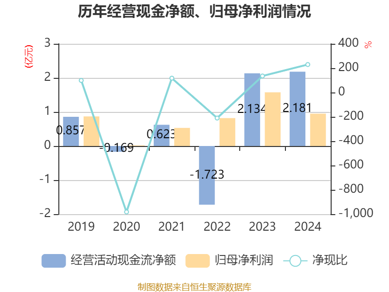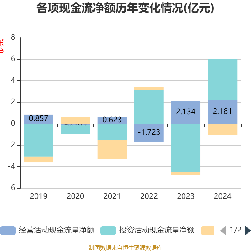 截至2024年,公司经营活动现金流净额为2.18亿元,同比增长2.21%;筹资活动现金流净额-1.05亿元,同比减少7832.58万元;投资活动现金流净额3.83亿元,上年同期为-4.51亿元。