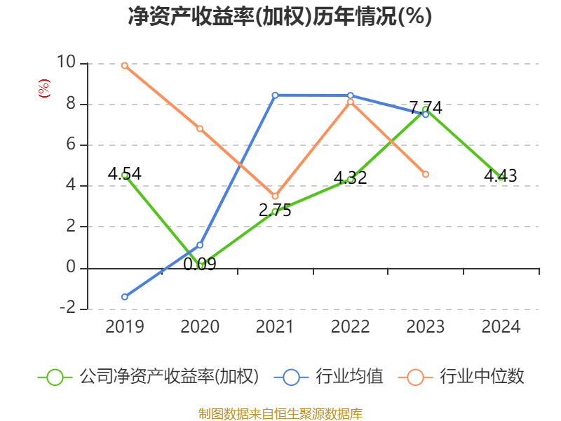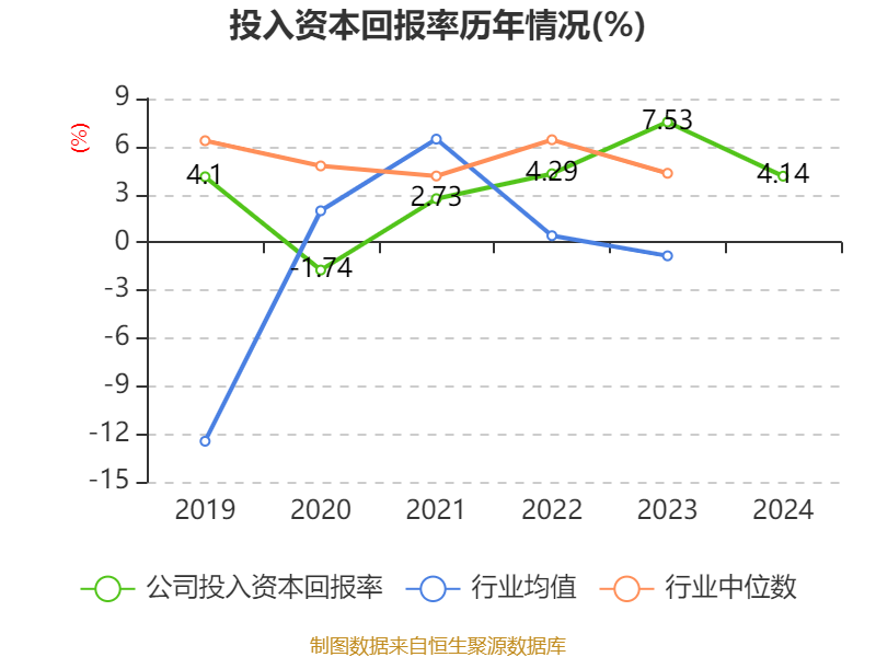 数据显示,2024年公司加权平均净资产收益率为4.43%,较上年同期下降3.31个百分点。公司2024年投入资本回报率为4.14%,较上年同期下降3.39个百分点。