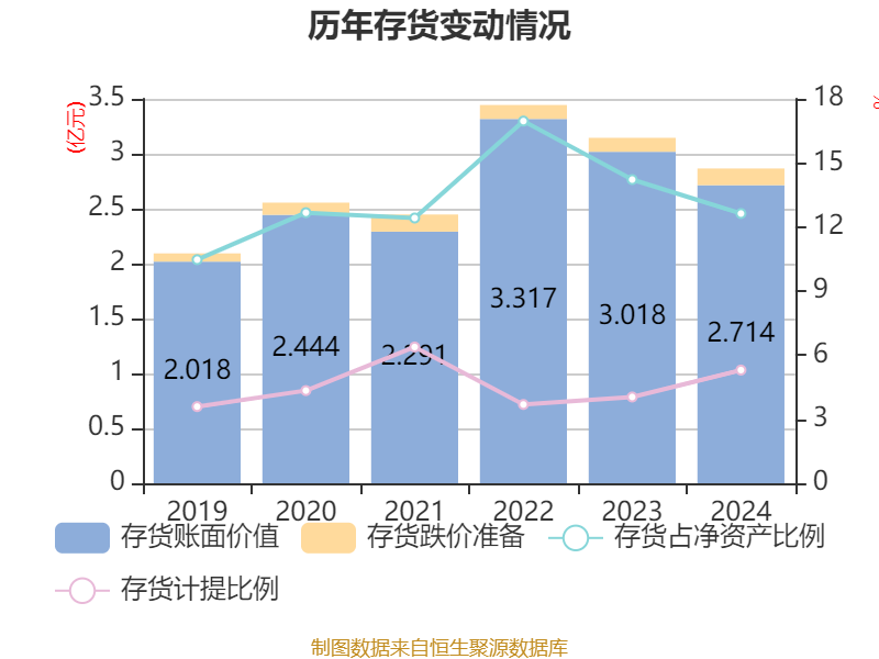 从存货变动来看,截至2024年末,公司存货账面价值为2.71亿元,占净资产的12.63%,较上年末减少3042.39万元。其中,存货跌价准备为1519.95万元,计提比例为5.3%。