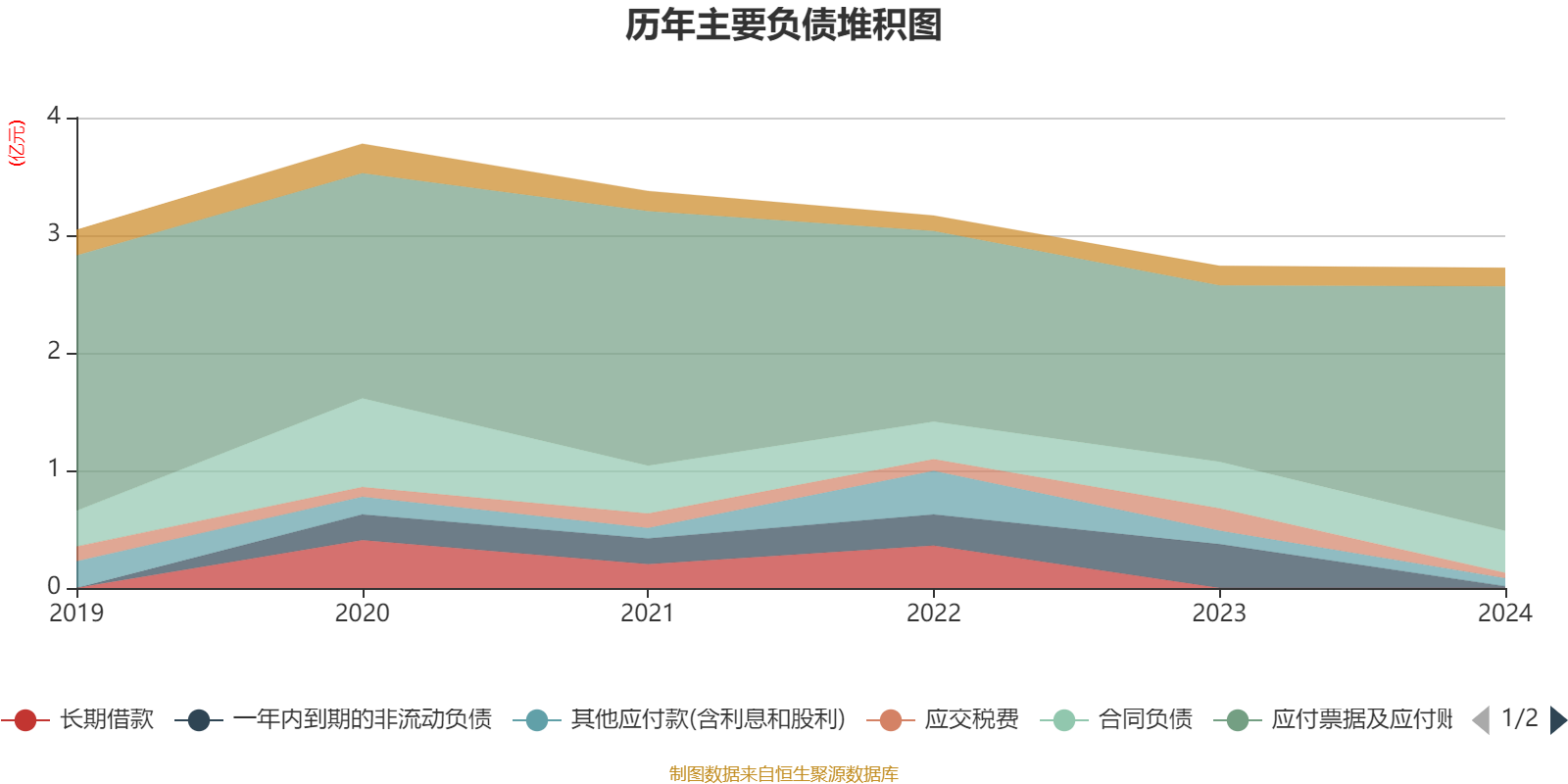 负债重大变化方面,截至2024年末,公司应付票据及应付账款较上年末增加38.71%,占公司总资产比重上升2.33个百分点;一年内到期的非流动负债较上年末减少95.94%,占公司总资产比重下降1.49个百分点;应交税费较上年末减少76.33%,占公司总资产比重下降0.61个百分点;其他应付款(含利息和股利)较上年末减少39.96%,占公司总资产比重下降0.2个百分点。