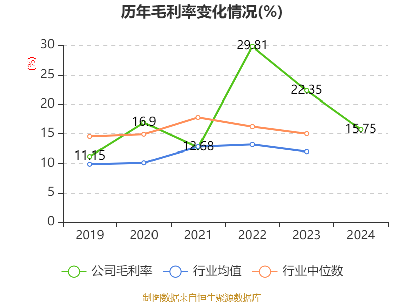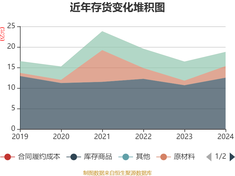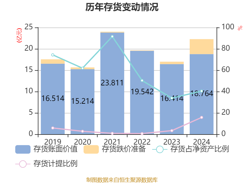 从存货变动来看,截至2024年末,公司存货账面价值为18.76亿元,占净资产的40.42%,较上年末增加2.35亿元。其中,存货跌价准备为3.5亿元,计提比例为15.72%。