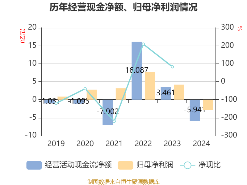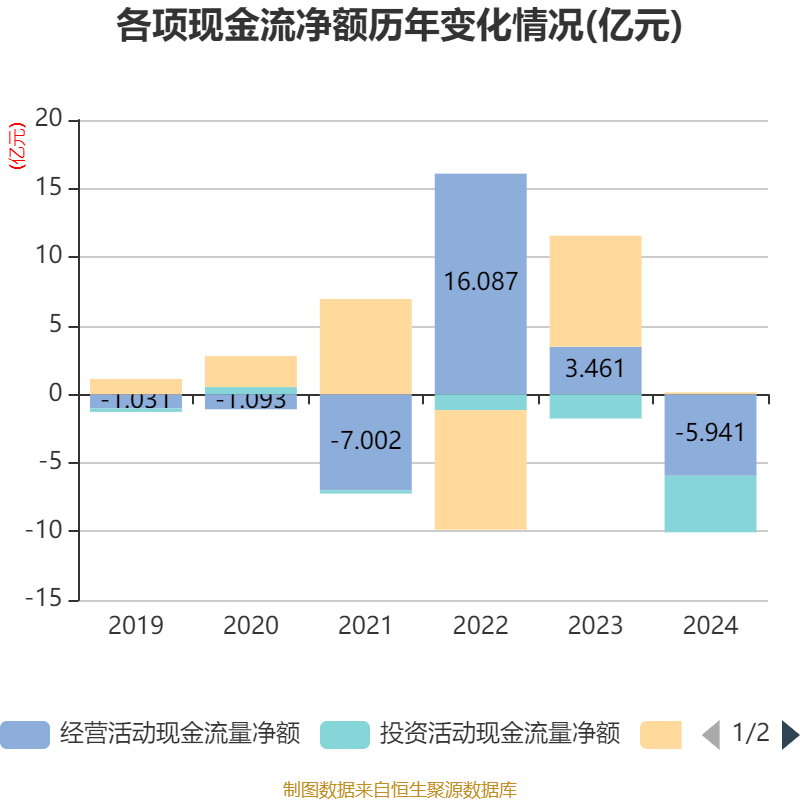 截至2024年,公司经营活动现金流净额为-5.94亿元,同比减少9.4亿元;筹资活动现金流净额1415.11万元,同比减少7.97亿元;投资活动现金流净额-4.13亿元,上年同期为-1.77亿元。