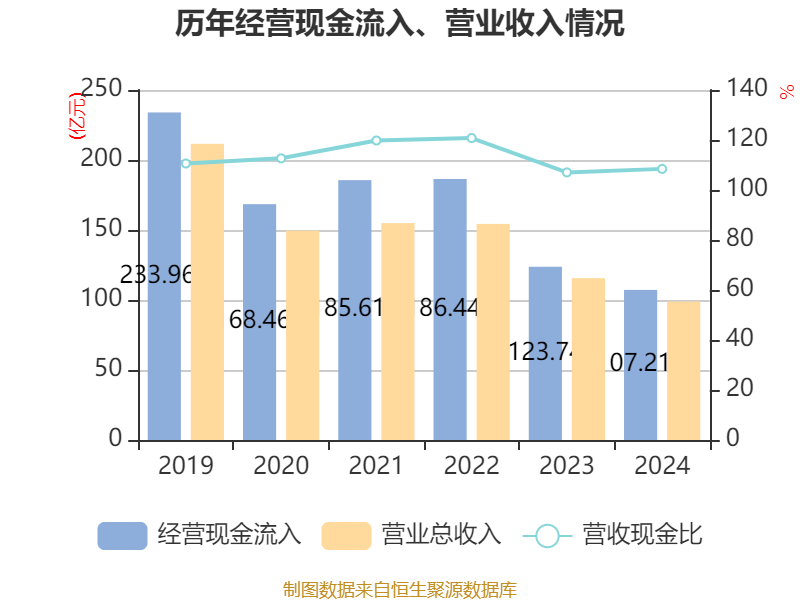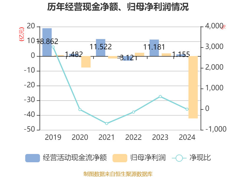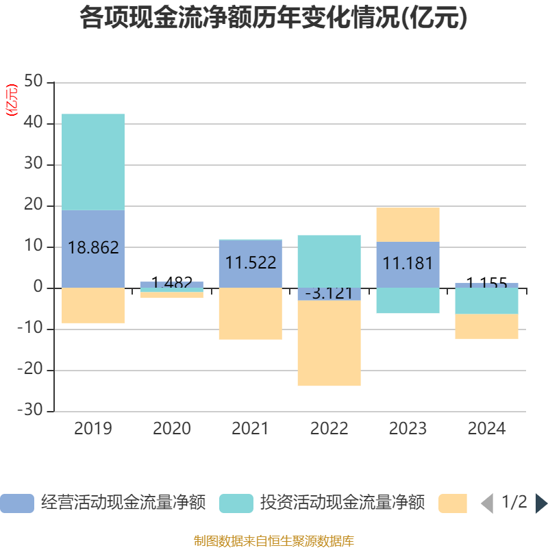 截至2024年,公司经营活动现金流净额为1.16亿元,同比下降89.67%;筹资活动现金流净额-6.03亿元,同比减少14.34亿元;投资活动现金流净额-6.43亿元,上年同期为-6.2亿元。
