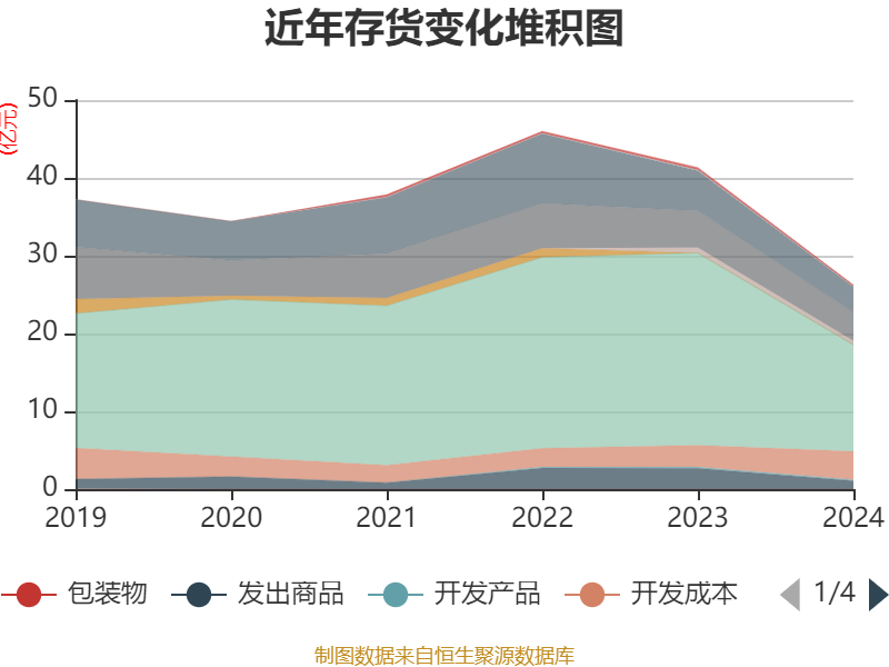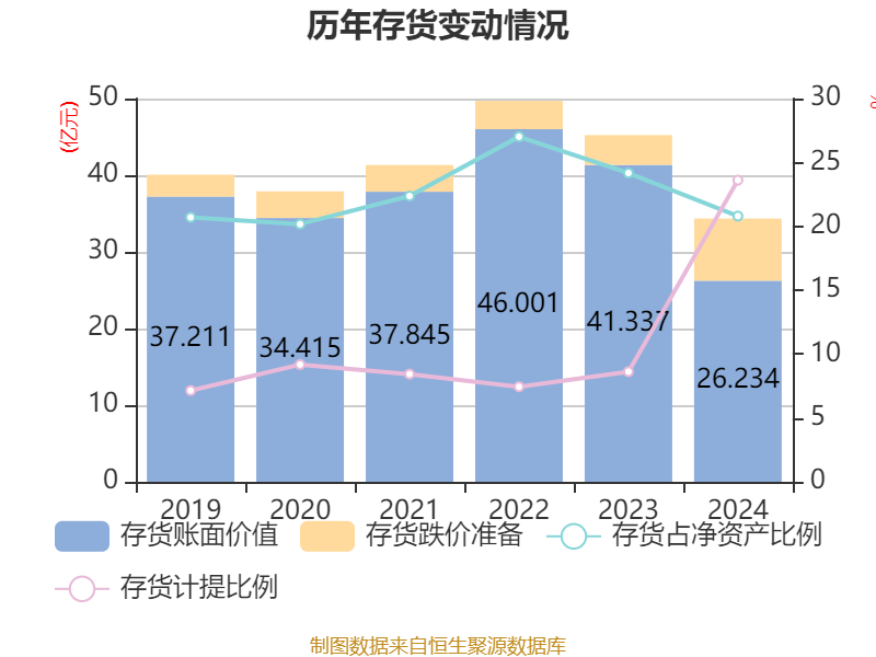 从存货变动来看,截至2024年末,公司存货账面价值为26.23亿元,占净资产的20.8%,较上年末减少15.1亿元。其中,存货跌价准备为8.11亿元,计提比例为23.61%。