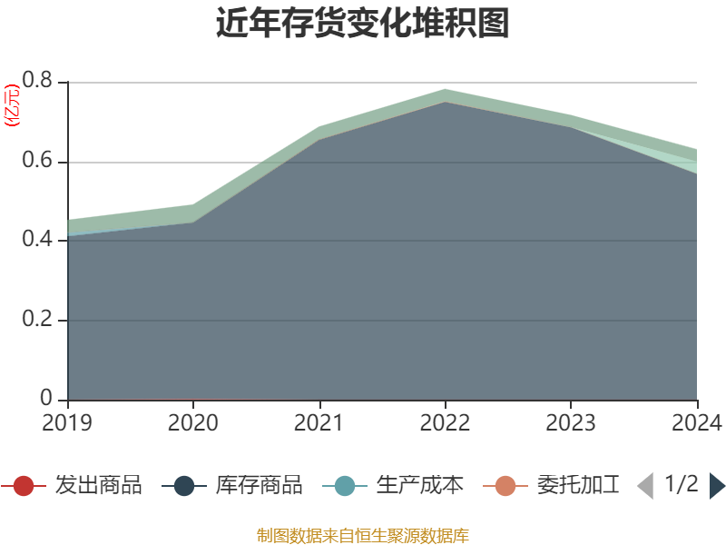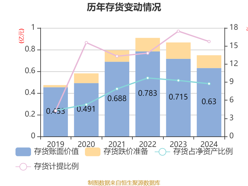 从存货变动来看,截至2024年末,公司存货账面价值为6298.52万元,占净资产的8.74%,较上年末减少855.42万元。其中,存货跌价准备为1176.98万元,计提比例为15.74%。