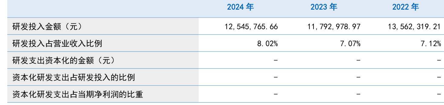 2024年全年,公司研发投入金额为1254.58万元,同比增长6.38%;研发投入占营业收入比例为8.02%,相比上年同期上升0.95个百分点。