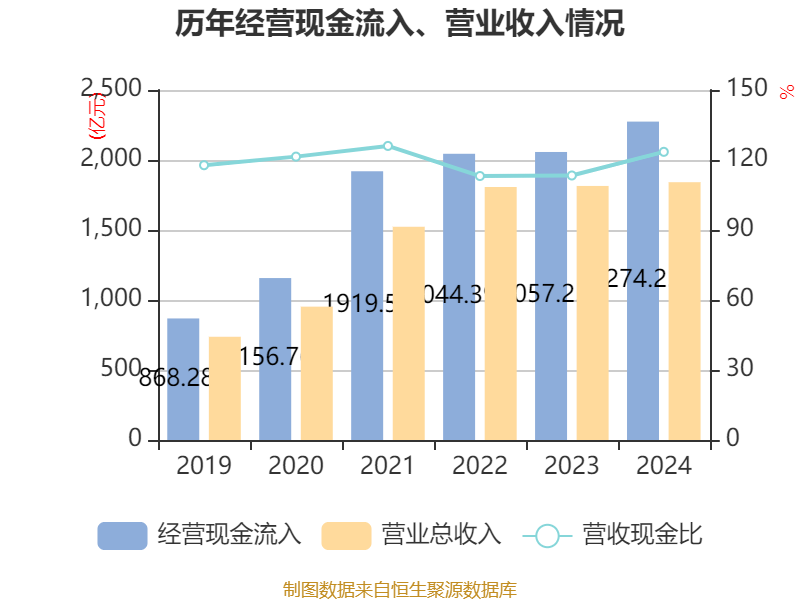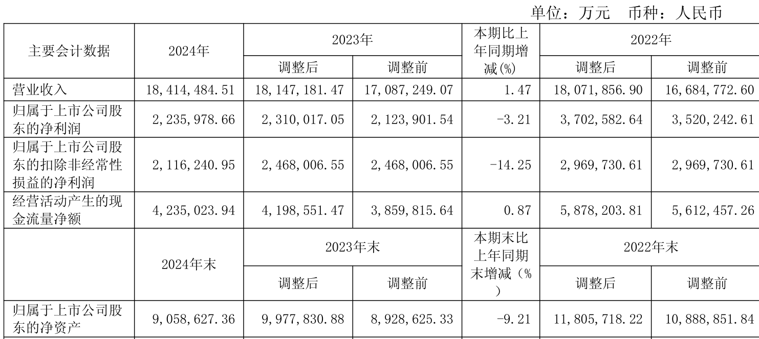 中证智能财讯陕西煤业(601225)4月26日披露2024年年度报告。2024年,公司实现营业总收入1841.45亿元,同比增长1.47%;归母净利润223.6亿元,同比下降3.21%;扣非净利润211.62亿元,同比下降14.25%;经营活动产生的现金流量净额为423.5亿元,同比增长0.87%;报告期内,陕西煤业基本每股收益为2.31元,加权平均净资产收益率为21.32%。公司2024年度分配预案为:拟向全体股东每10股派现11.36元(含税)。