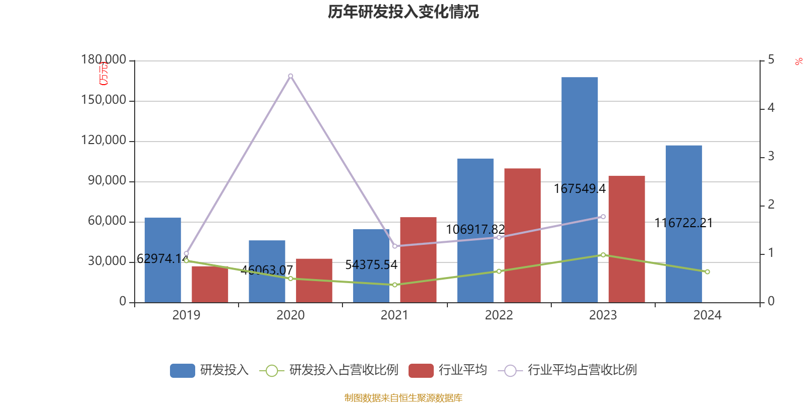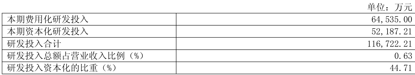 2024年全年,公司研发投入金额为11.67亿元,同比下降30.34%;研发投入占营业收入比例为0.63%,相比上年同期下降0.35个百分点。此外,公司全年研发投入资本化率为44.71%。