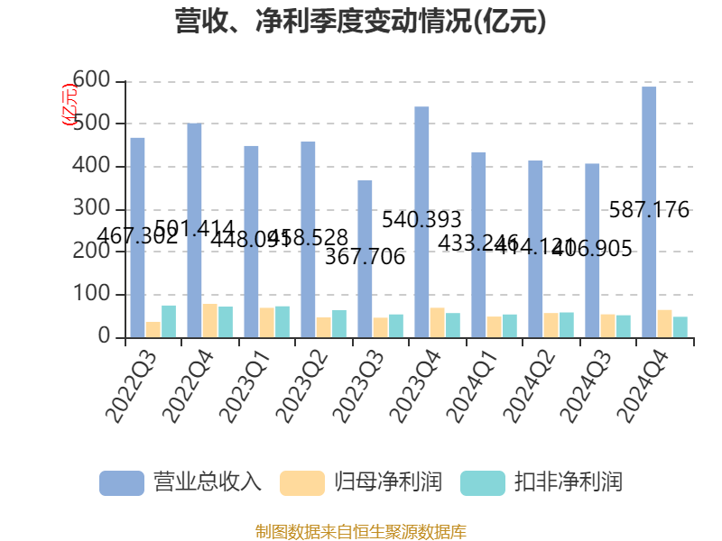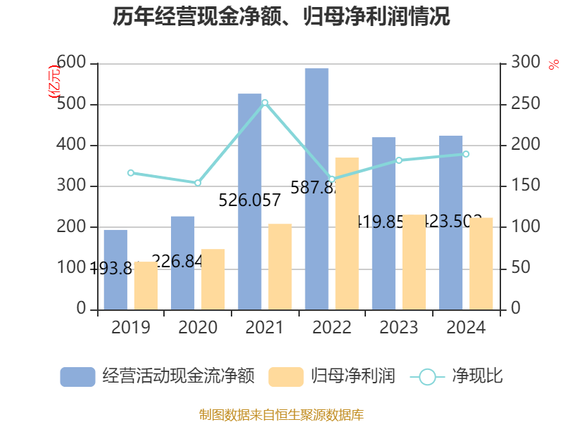 截至2024年,公司经营活动现金流净额为423.5亿元,同比增长0.87%;筹资活动现金流净额-354.61亿元,同比增加181.57亿元;投资活动现金流净额-58.54亿元,上年同期为-153.03亿元。