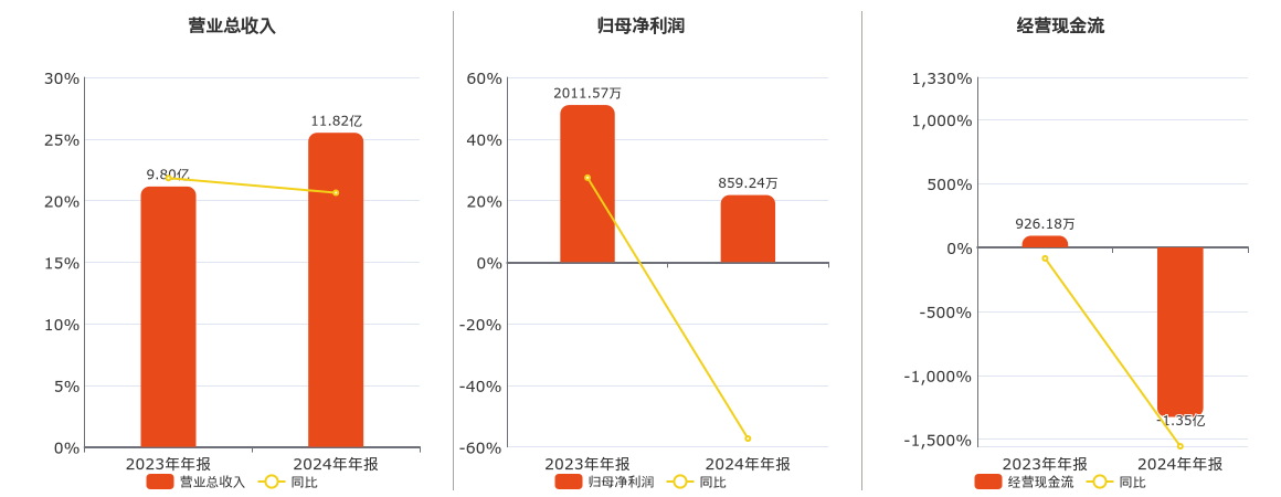 公司营业总收入为11.82亿元,在已披露的同业公司中排名第22。归母净利润为859.24万元,在已披露的同业公司中排名第28,较去年同报告期归母净利润减少1152.33万元,同比较去年同期下降57.29%。经营活动现金净流入为-1.35亿元,在已披露的同业公司中排名第28,较去年同报告期经营活动现金净流入减少1.44亿元,同比较去年同期下降1554.94%。