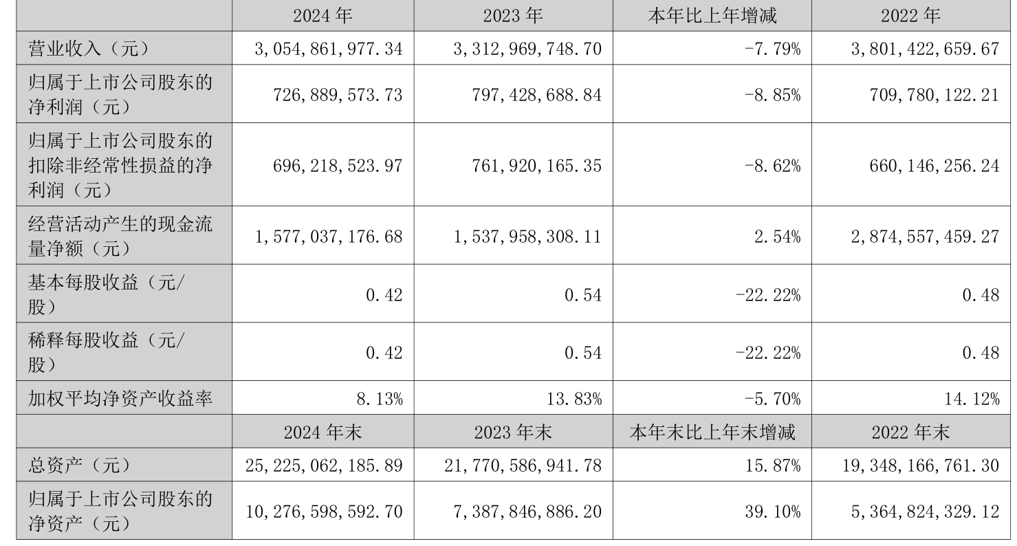 中证智能财讯川能动力(000155)4月28日披露2024年年度报告。2024年,公司实现营业总收入30.55亿元,同比下降7.79%;归母净利润7.27亿元,同比下降8.85%;扣非净利润6.96亿元,同比下降8.62%;经营活动产生的现金流量净额为15.77亿元,同比增长2.54%;报告期内,川能动力基本每股收益为0.42元,加权平均净资产收益率为8.13%。