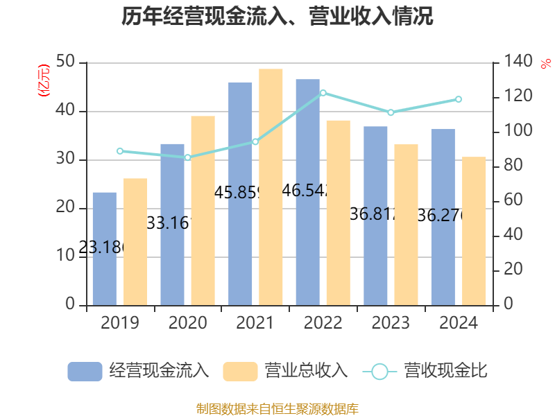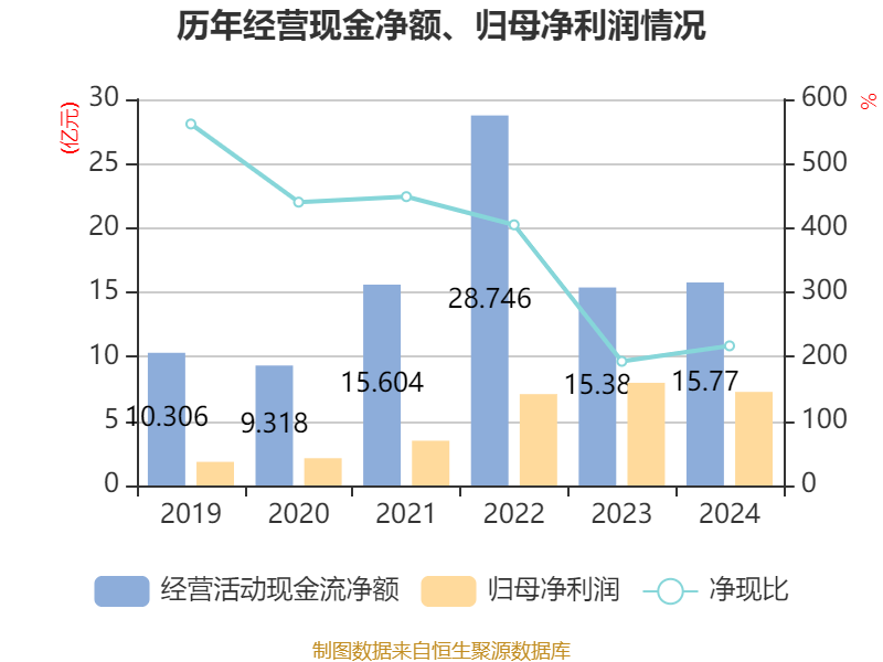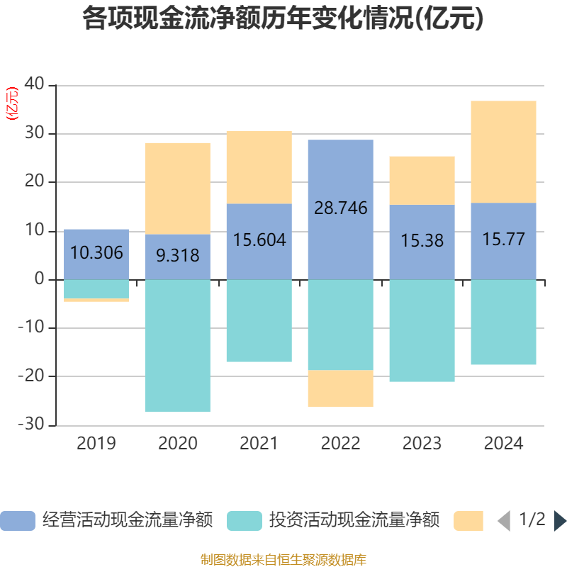截至2024年,公司经营活动现金流净额为15.77亿元,同比增长2.54%;筹资活动现金流净额20.97亿元,同比增加11.03亿元;投资活动现金流净额-17.52亿元,上年同期为-21.05亿元。