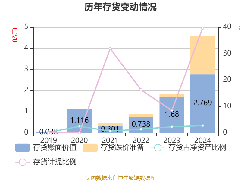 从存货变动来看,截至2024年末,公司存货账面价值为2.77亿元,占净资产的2.69%,较上年末增加1.09亿元。其中,存货跌价准备为1.82亿元,计提比例为39.62%。