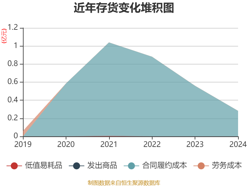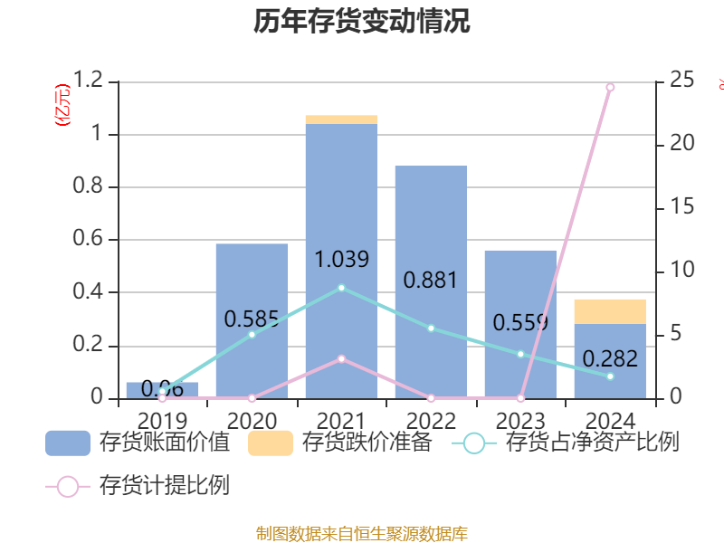 从存货变动来看,截至2024年末,公司存货账面价值为2817.83万元,占净资产的1.72%,较上年末减少2775.35万元。其中,存货跌价准备为916.59万元,计提比例为24.54%。
