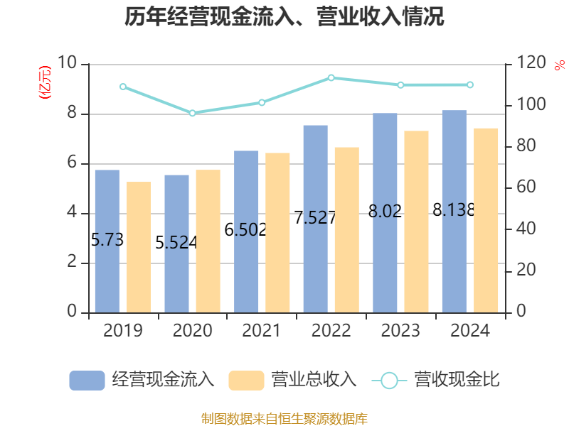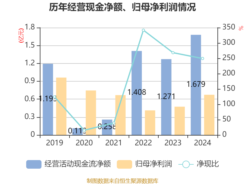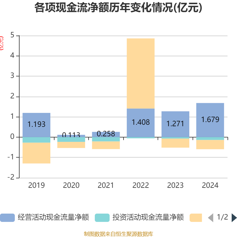 截至2024年,公司经营活动现金流净额为1.68亿元,同比增长32.12%;筹资活动现金流净额-4534.25万元,同比减少71.04万元;投资活动现金流净额-1422.42万元,上年同期为-723.28万元。