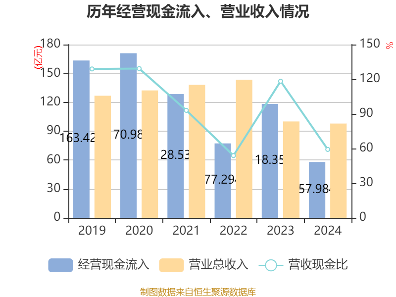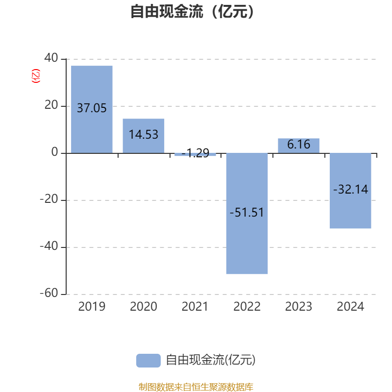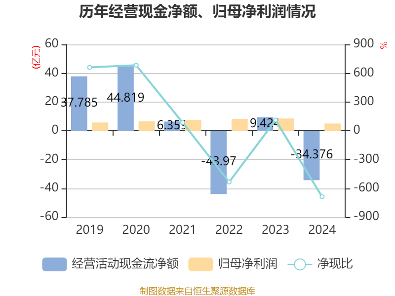 截至2024年,公司经营活动现金流净额为-34.38亿元,同比减少43.8亿元;筹资活动现金流净额-2亿元,同比增加2.84亿元;投资活动现金流净额12.71亿元,上年同期为-1.66亿元。