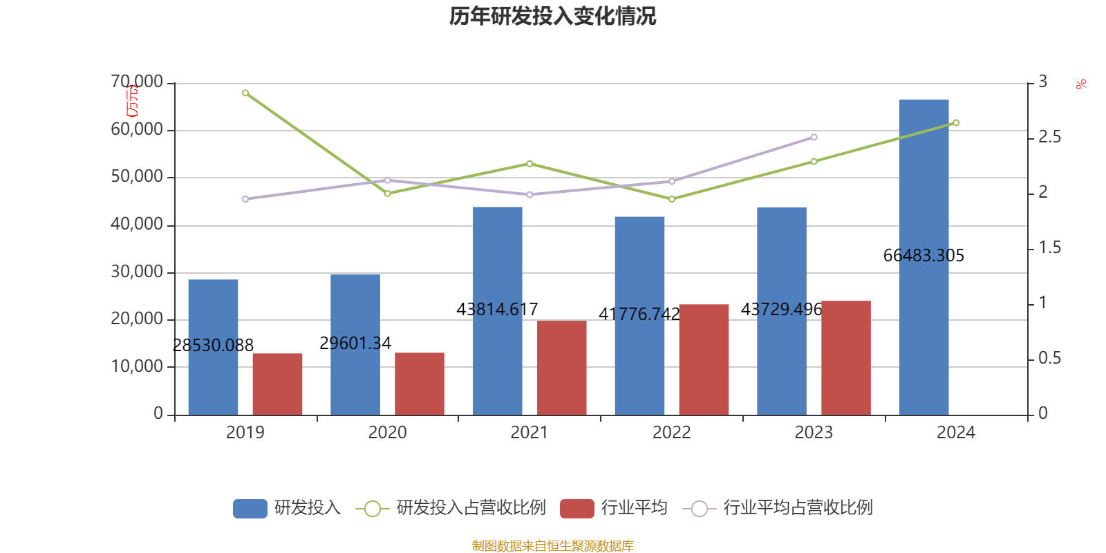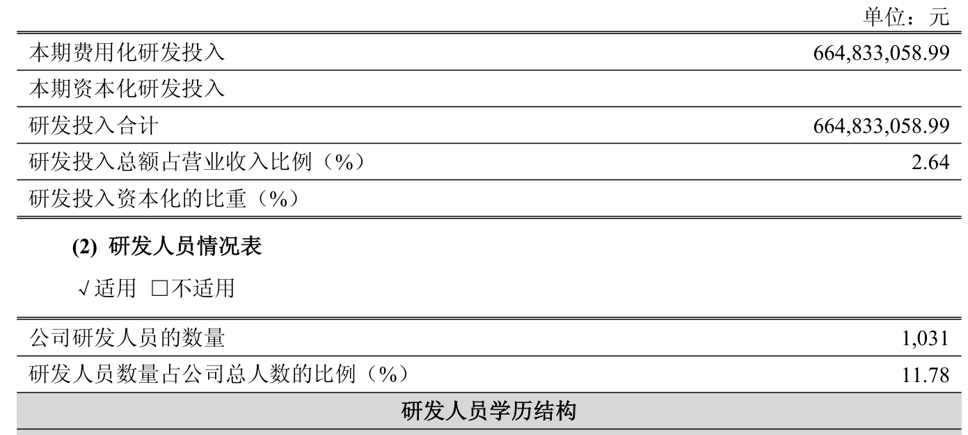 2024年全年,公司研发投入金额为6.65亿元,同比增长52.03%;研发投入占营业收入比例为2.64%,相比上年同期上升0.35个百分点。此外,公司全年研发投入资本化率为0%。
