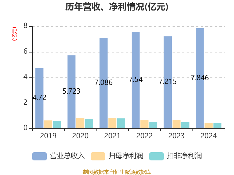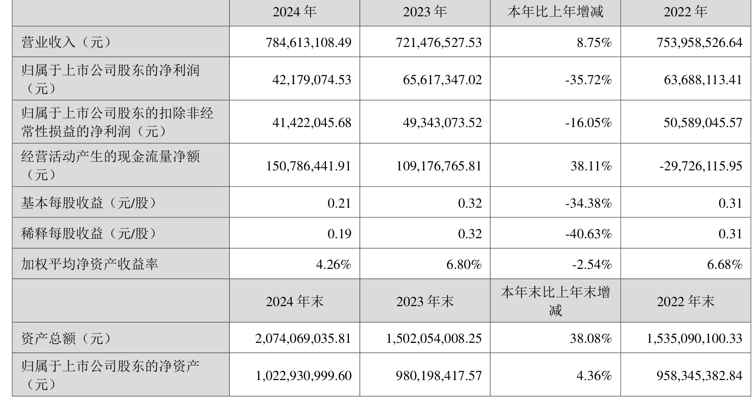 中证智能财讯严牌股份(301081)4月28日披露2024年年度报告。2024年,公司实现营业总收入7.85亿元,同比增长8.75%;归母净利润4217.91万元,同比下降35.72%;扣非净利润4142.2万元,同比下降16.05%;经营活动产生的现金流量净额为1.51亿元,同比增长38.11%;报告期内,严牌股份基本每股收益为0.21元,加权平均净资产收益率为4.26%。公司2024年度分配预案为:拟向全体股东每10股派现3元(含税)。