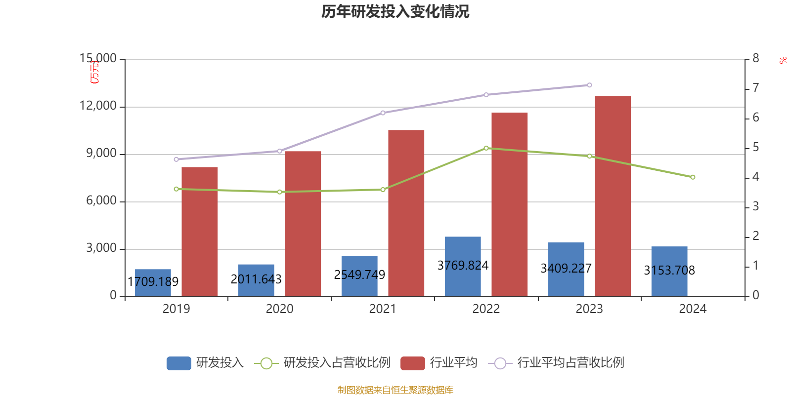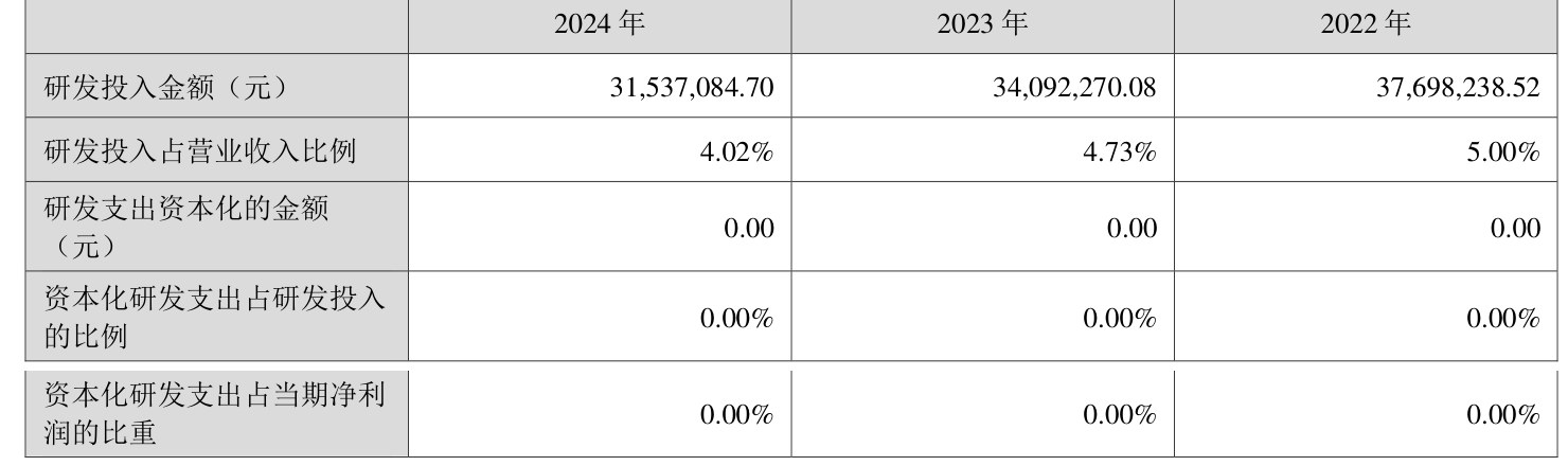 2024年全年,公司研发投入金额为3153.71万元,同比下降7.49%;研发投入占营业收入比例为4.02%,相比上年同期下降0.71个百分点。此外,公司全年研发投入资本化率为0%。