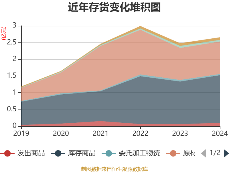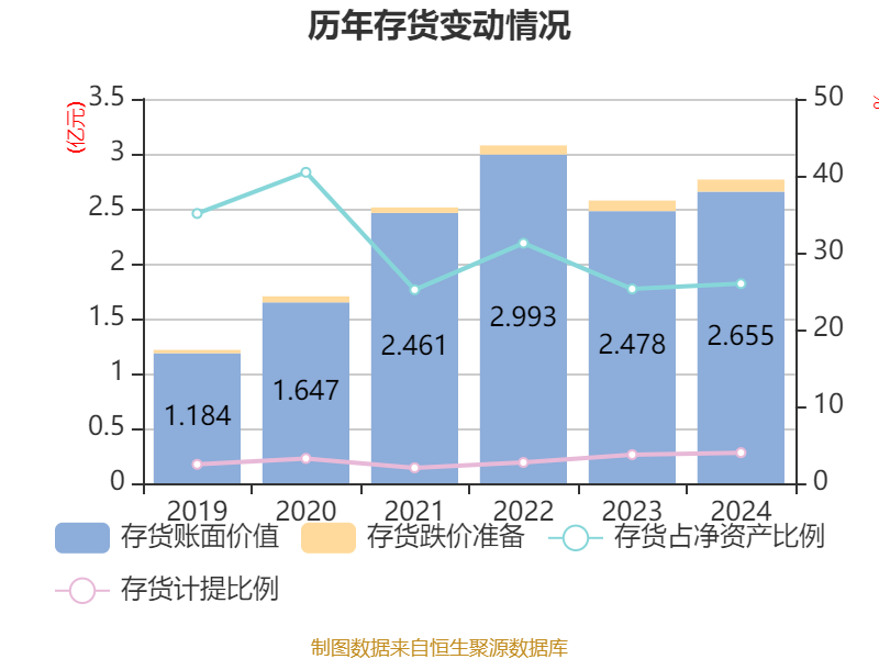 从存货变动来看,截至2024年末,公司存货账面价值为2.66亿元,占净资产的25.96%,较上年末增加1772.46万元。其中,存货跌价准备为1100.17万元,计提比例为3.98%。