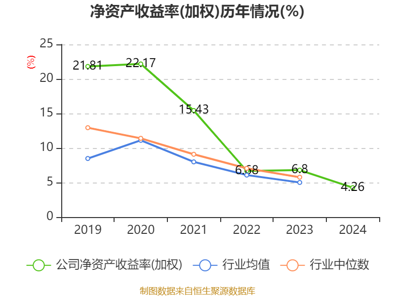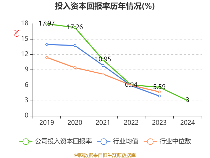 数据显示,2024年公司加权平均净资产收益率为4.26%,较上年同期下降2.54个百分点。公司2024年投入资本回报率为3%,较上年同期下降2.59个百分点。
