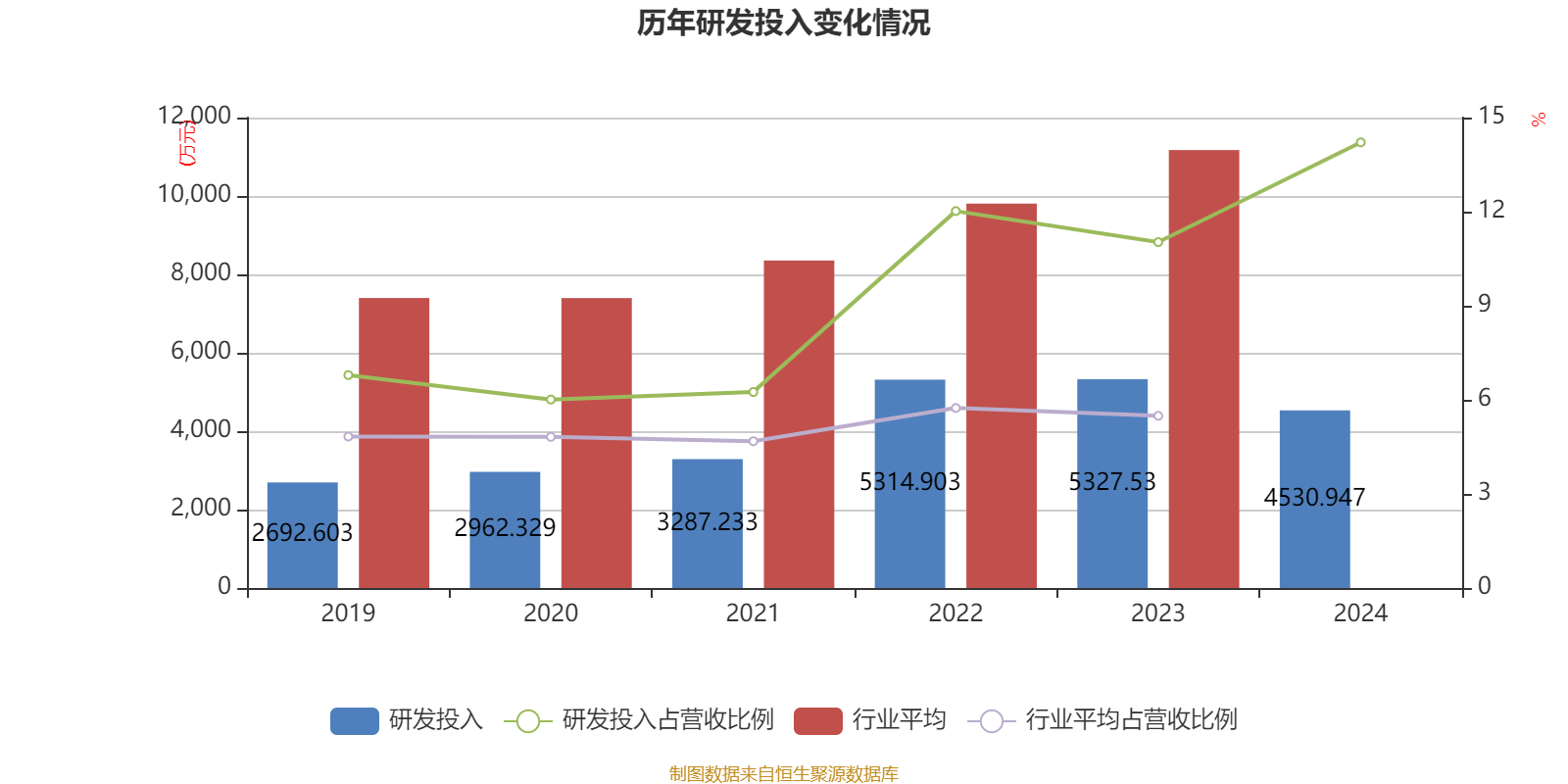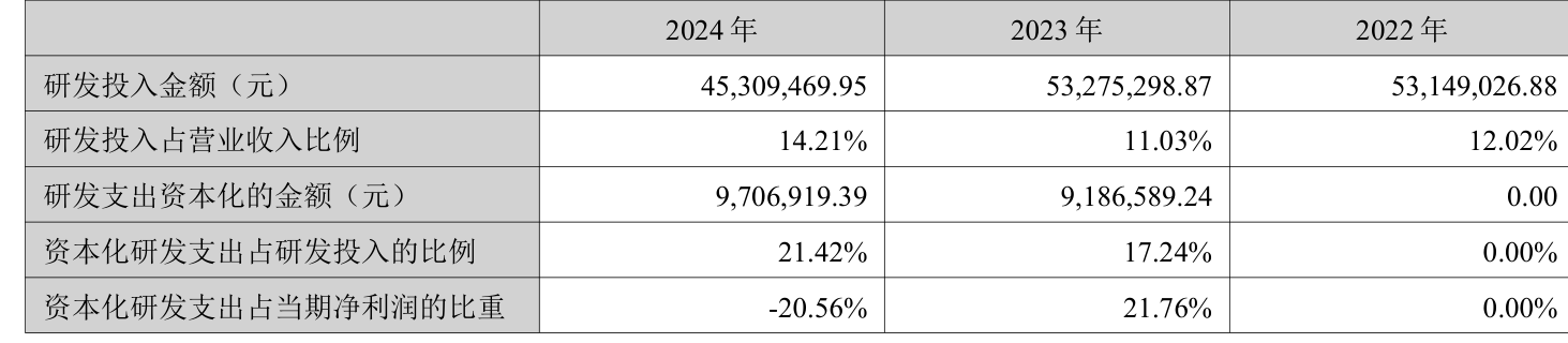 2024年全年,公司研发投入金额为4530.95万元,同比下降14.95%;研发投入占营业收入比例为14.21%,相比上年同期上升3.18个百分点。此外,公司全年研发投入资本化率为21.42%。