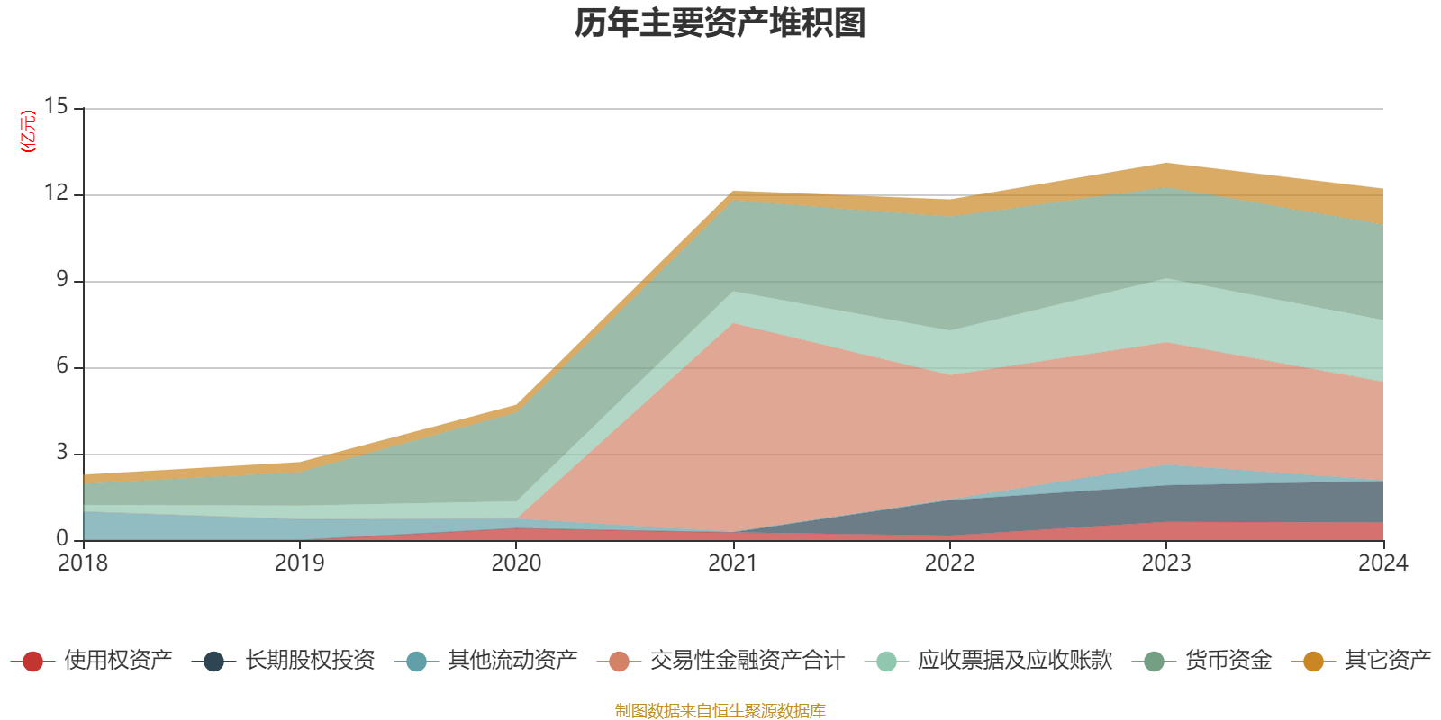 资产重大变化方面,截至2024年末,公司其他流动资产较上年末减少95.66%,占公司总资产比重下降5.22个百分点;交易性金融资产合计较上年末减少19.62%,占公司总资产比重下降4.46个百分点;货币资金较上年末增加4.66%,占公司总资产比重上升2.98个百分点;长期股权投资较上年末增加13.62%,占公司总资产比重上升2.12个百分点。