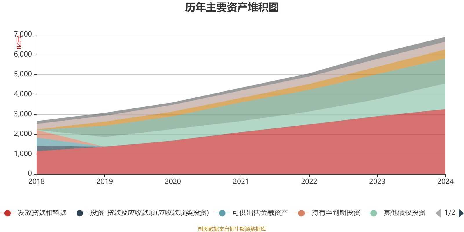 资产重大变化方面,截至2024年末,公司其他债权投资较上年末增加50.65%,占公司总资产比重上升4.58个百分点;债权投资较上年末减少0.43%,占公司总资产比重下降2.64个百分点;货币资金较上年末减少0.32%,占公司总资产比重下降0.82个百分点;发放贷款和垫款较上年末增加12.32%,占公司总资产比重下降0.71个百分点。