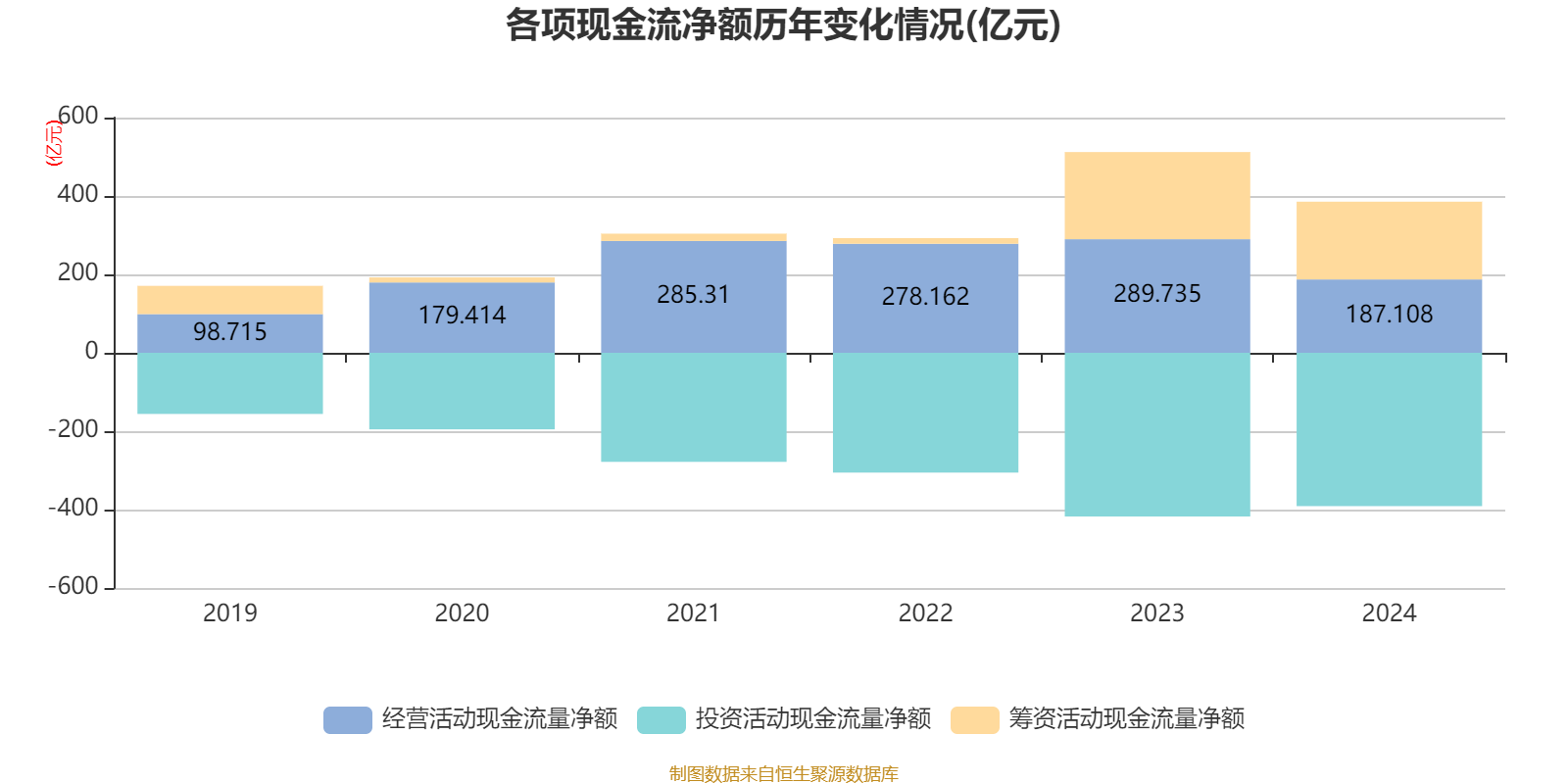 截至2024年,公司经营活动现金流净额为187.11亿元,同比下降35.42%;筹资活动现金流净额198.4亿元,同比减少23.98亿元;投资活动现金流净额-391.11亿元,上年同期为-417.59亿元。