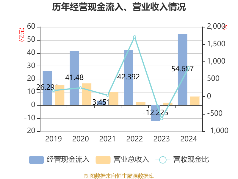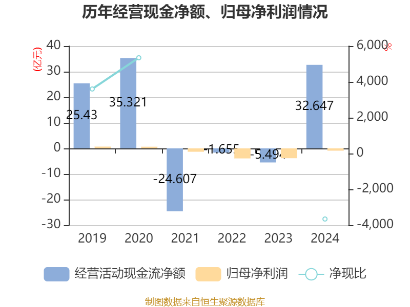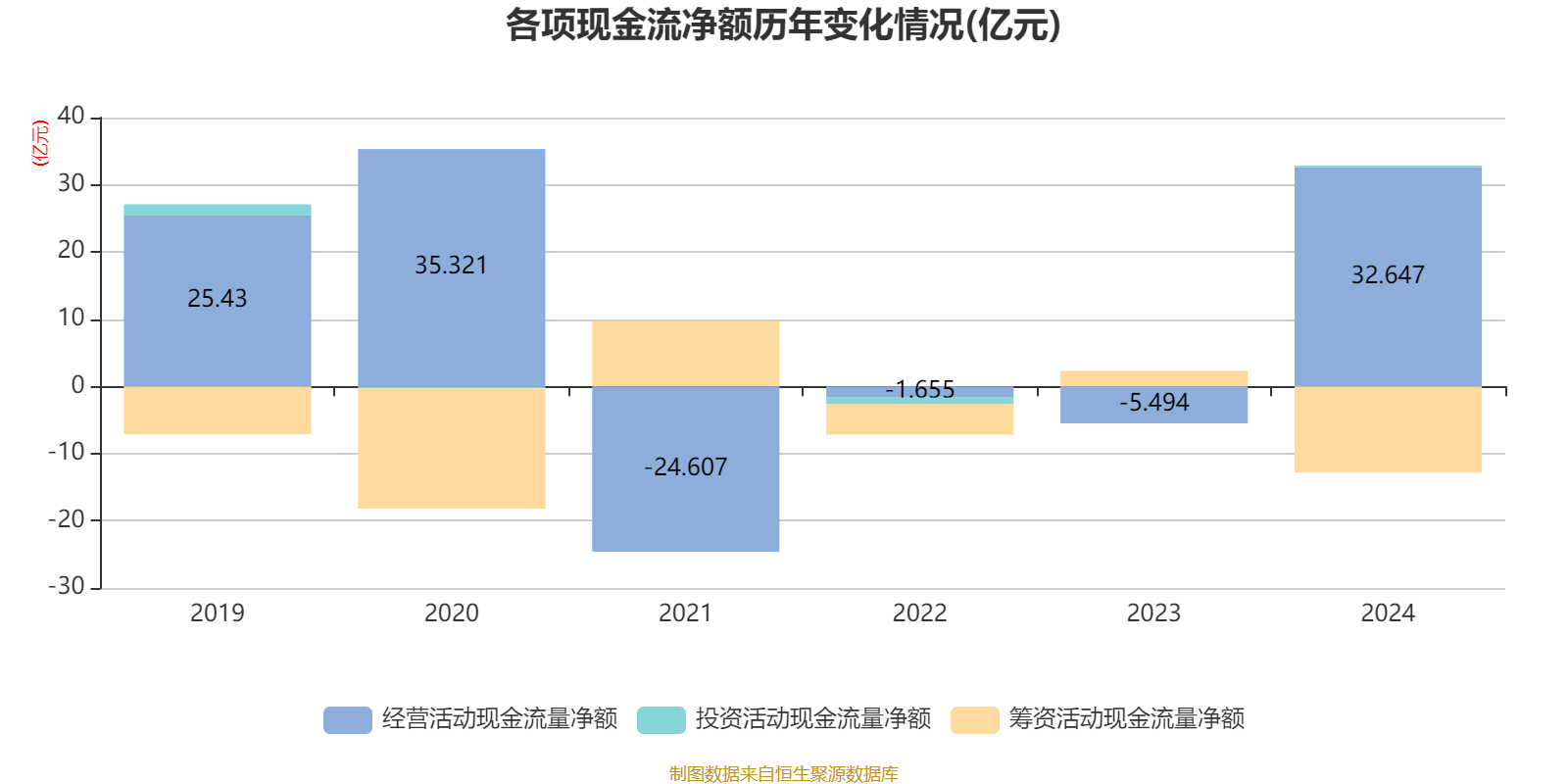 截至2024年,公司经营活动现金流净额为32.65亿元,同比增加38.14亿元;筹资活动现金流净额-12.79亿元,同比减少15.11亿元;投资活动现金流净额1997.43万元,上年同期为-133.54万元。