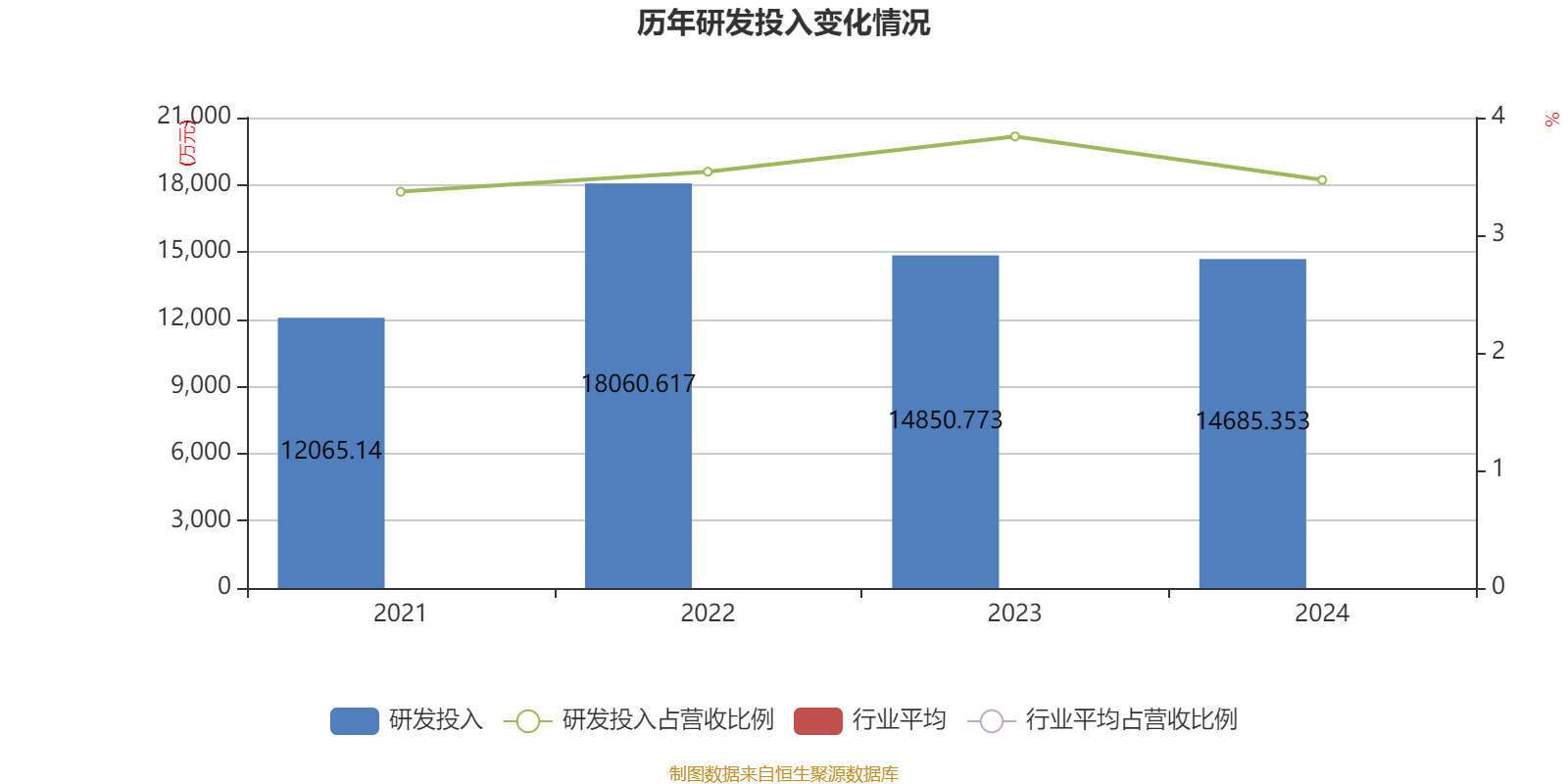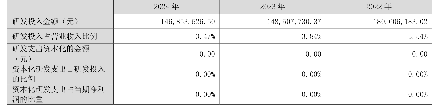2024年全年,公司研发投入金额为1.47亿元,同比下降1.11%;研发投入占营业收入比例为3.47%,相比上年同期下降0.37个百分点。此外,公司全年研发投入资本化率为0%。