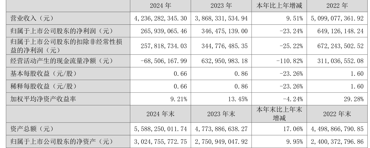 中证智能财讯泰禾股份(301665)4月28日披露2024年年度报告。2024年,公司实现营业总收入42.36亿元,同比增长9.51%;归母净利润2.66亿元,同比下降23.24%;扣非净利润2.58亿元,同比下降25.22%;经营活动产生的现金流量净额为-6850.62万元,上年同期为6.33亿元;报告期内,泰禾股份基本每股收益为0.66元,加权平均净资产收益率为9.21%。公司2024年度分配预案为:拟向全体股东每10股派现4元(含税)。