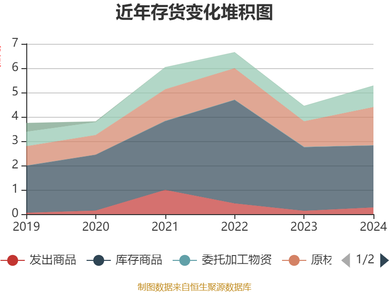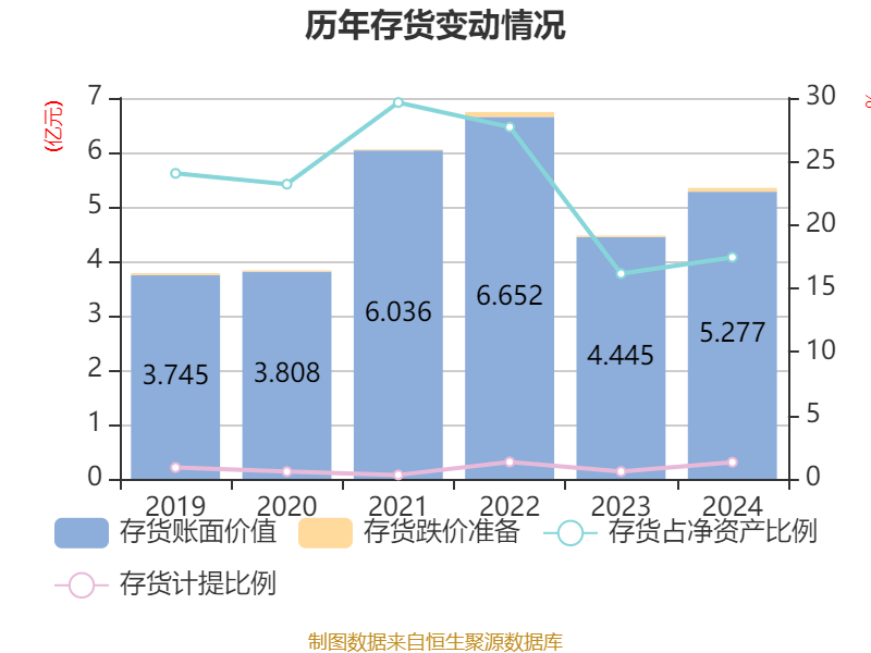 从存货变动来看,截至2024年末,公司存货账面价值为5.28亿元,占净资产的17.45%,较上年末增加8317.48万元。其中,存货跌价准备为700.72万元,计提比例为1.31%。