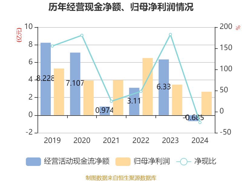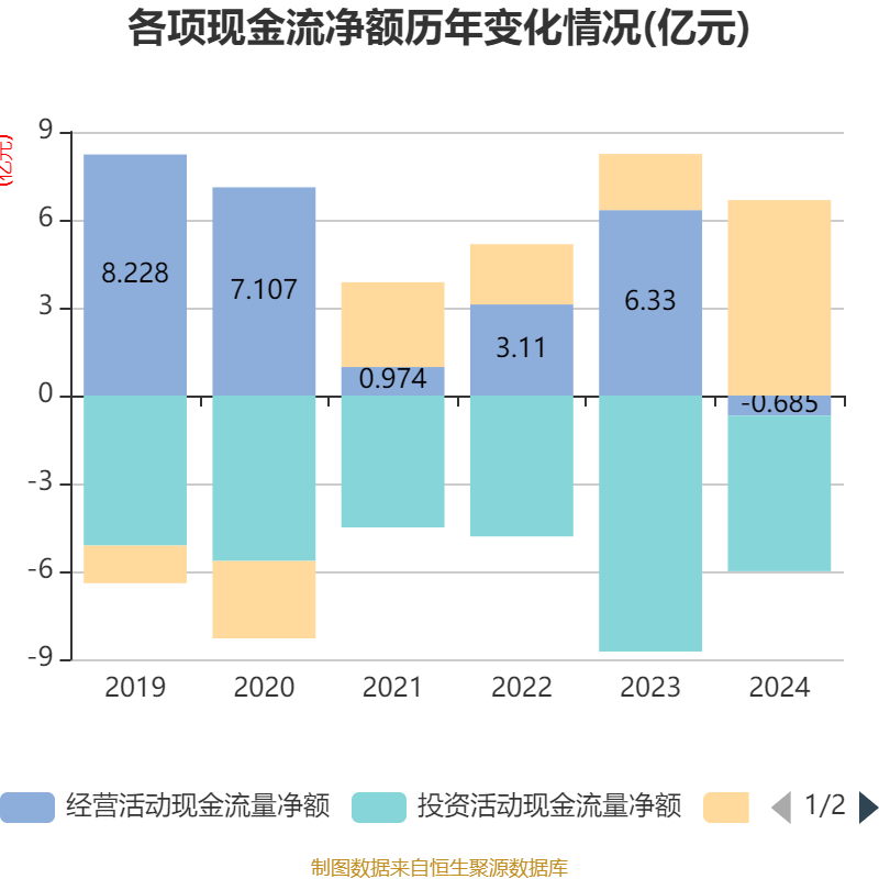 截至2024年,公司经营活动现金流净额为-6850.62万元,同比减少7.01亿元;筹资活动现金流净额6.67亿元,同比增加4.76亿元;投资活动现金流净额-5.31亿元,上年同期为-8.74亿元。
