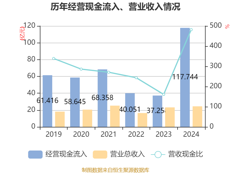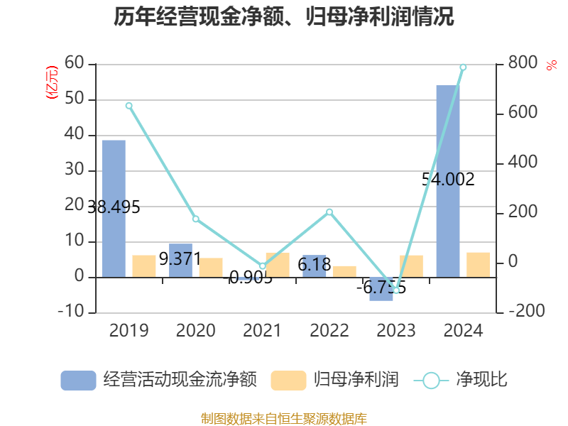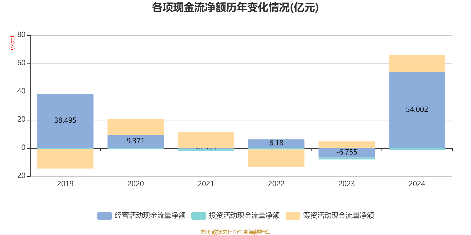 截至2024年,公司经营活动现金流净额为54亿元,同比增加60.76亿元;筹资活动现金流净额12.07亿元,同比增加7.35亿元;投资活动现金流净额-1.26亿元,上年同期为-1.3亿元。