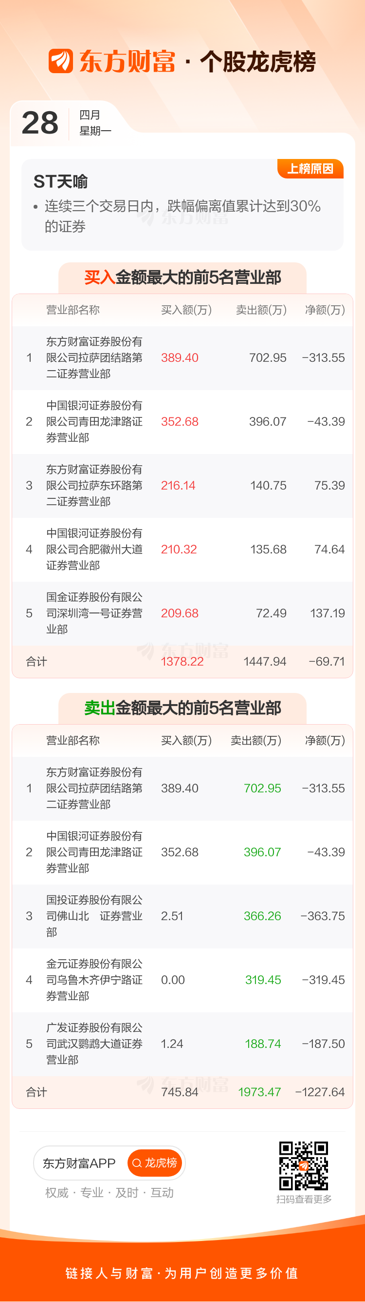交易所2025年4月28日公布的交易公开信息显示,ST天喻因成为连续三个交易日内,跌幅偏离值累计达到30%的证券上榜。ST天喻当日收报2.62元,涨跌幅-15.48%,换手率8.63%,成交额9934.95万。异常期间4月25日至4月28日,期间涨幅-32.30%,累计偏离值-31.53%,区间成交额1.49亿。