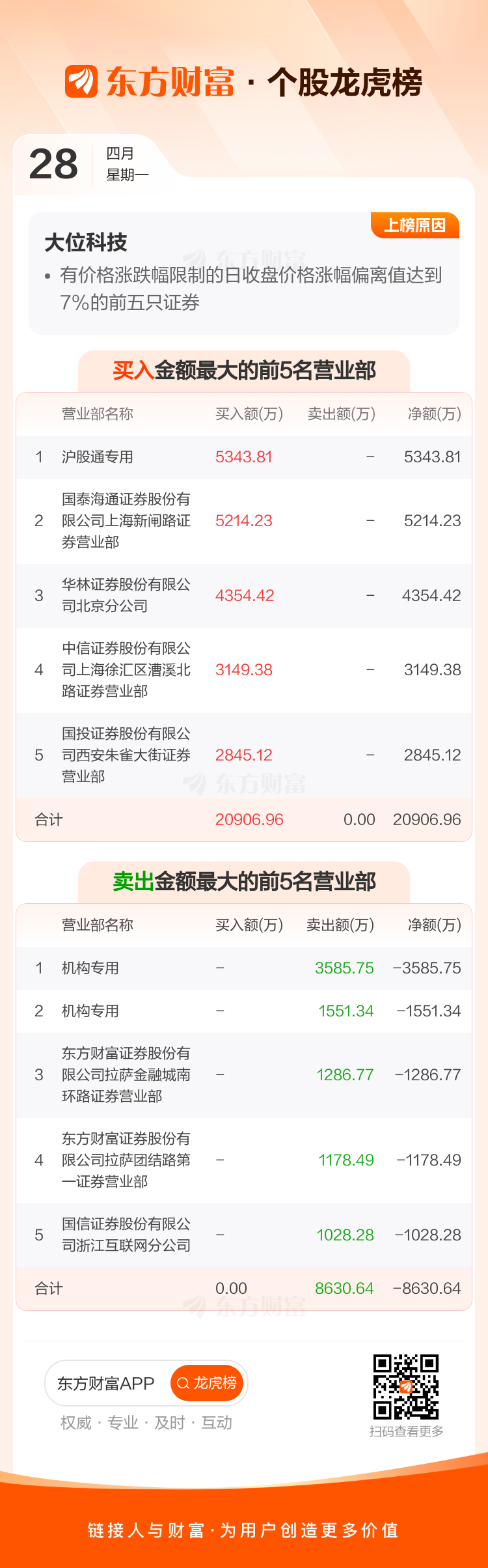 交易所2025年4月28日公布的交易公开信息显示,大位科技因成为有价格涨跌幅限制的日收盘价格涨幅偏离值达到7%的前五只证券上榜。大位科技当日收报7元,涨跌幅10.06%,偏离值10.26%,换手率12.15%,成交额12.46亿。